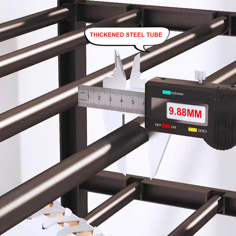 • Built with strong 9.88mm steel pipes and durable PP connectors, each shelf offers solid stability and holds a variety of shoes—from casual sneakers to boots and sandals. The widened shelf depth and 16.5 cm spacing between layers offer ample room for different shoe styles, while the raised base design keeps shoes off the floor, helping to protect against dust and moisture.