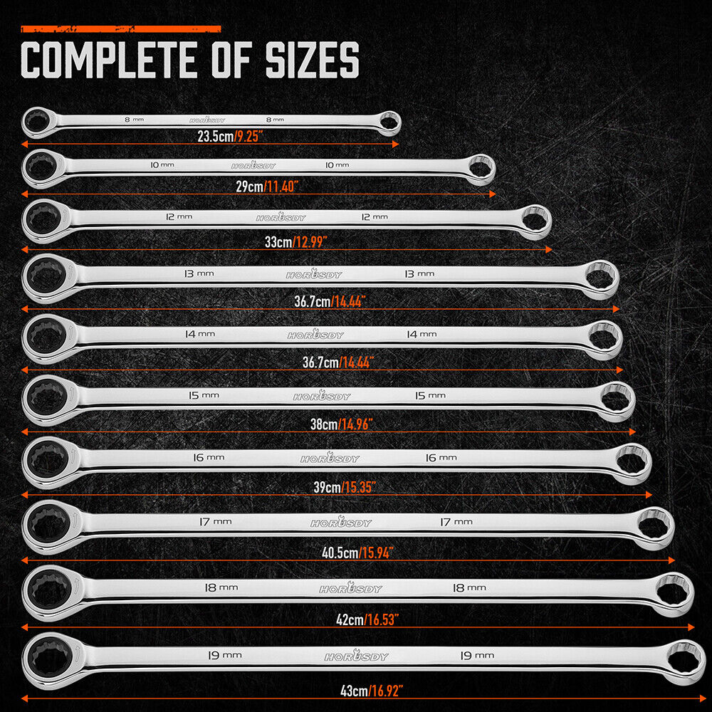 HORUSDY 10Pc Extra Long Ratchet Spanner Set Aviation Double End 8-19mm w/t Pouch
