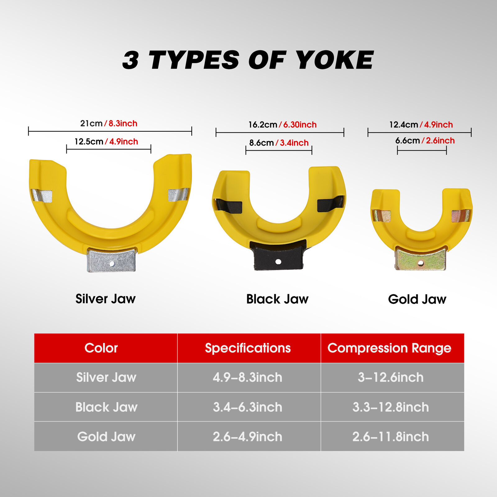 3 Interchangeable Yokes: With three yoke options, our spring strut compressor fits various vehicle models: Gold: 2.6-4.9 inch spring holder (compression range: 2.6-11.8 inches); Black: 3.4-6.3 inch spring holder (compression range: 3.3-12.8 inches); Silver: 4.9-8.3 inch spring holder (compression range: 3-12.6 inches).