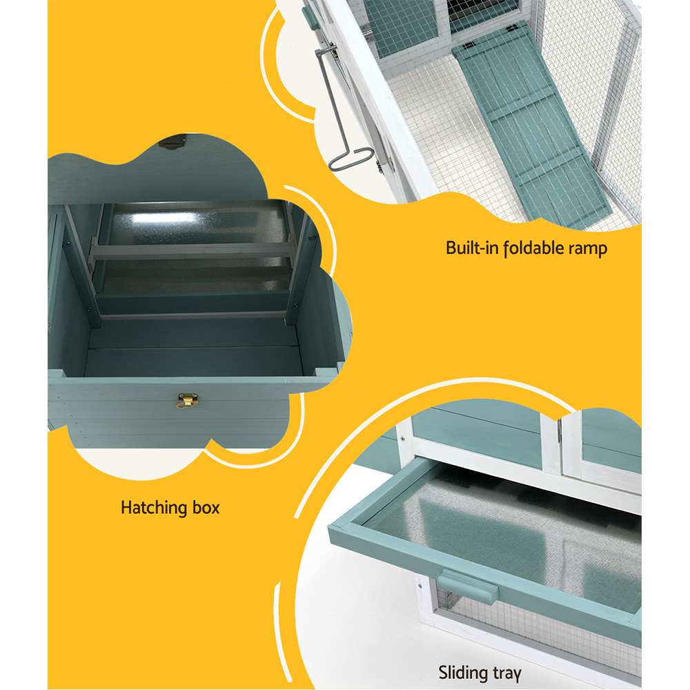 Give your beloved pets a safe and comfortable home to sleep, rest, play, and relax. The i.Pet’s pet hutch makes a cosy home for your dear pets they will love and cherish forever. This pet hutch is suitable for smaller pets such as rabbits, chickens, hens, guinea pigs, hamsters, chinchillas and ferrets. Our pet hutch features a solid fir wood construction with galvanised mesh that ensures its sturdiness and durability for many years. It has a stable and firm base with strong metal support rod that’s crucial for stability. Our pet hutch has green asphalt felt roof that provides good protection from sun and rain, keeping them cool in summer and warm in winter. It has a spacious integrated ground enclosed play area that allows your pets to have a great playtime outdoors. And the built-in foldable ramp that connects the ground area and hutch enables convenient entry and exit. Furthermore, the pet hutch also comes with a hatching box for egg collection and a slide-out tray for easy cleaning, and the entrance door with sturdy security locks makes it even more convenient and reliable. The enclosed play area has a mesh structure, which keeps your pets comfortable and well-ventilated. This pet hutch will give your beloved pets the utmost joy and pleasure. Gift this pet hutch to your pets today, and be sure to get much love in return.