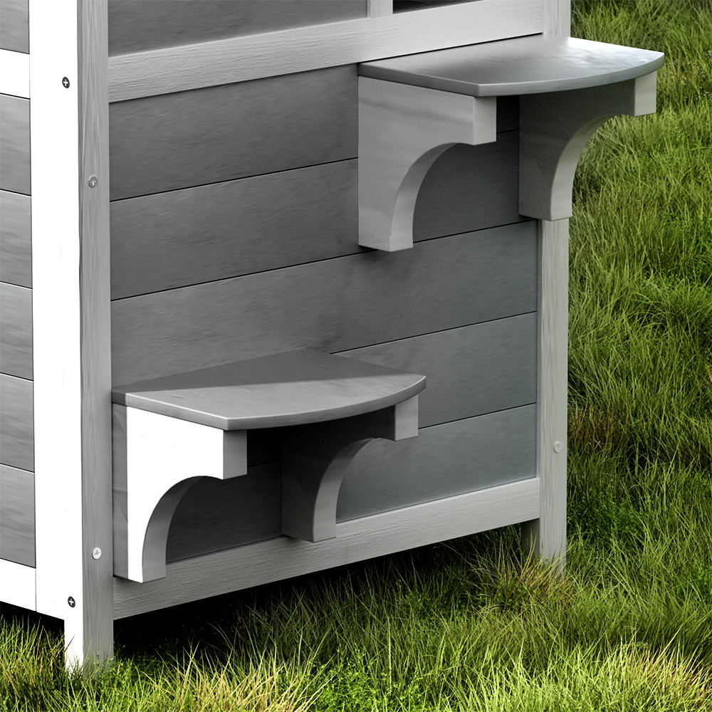 Gift your pets and fun and functional play house with the i.Pet Pet Hutch. This outdoor and indoor shelter is made from solid fir wood with a weather-resistant hinged asphalt roof and additional rainproof eaves. Three exit points and a transparent flap door give your pets plenty of ways to get in and out of their play space. An easy-viewing window lets them view the world in comfort, while two sturdy jumping platforms encourage their natural climbing instincts. The floor is removable to help with cleaning, and the rooftop can be opened for easier ventilation. Spacious and comfortable, the pet hutch is suitable for small pets such as cats, puppies and rabbits. Enrich your pets and help them flourish with the i.Pet Pet Hutch.
