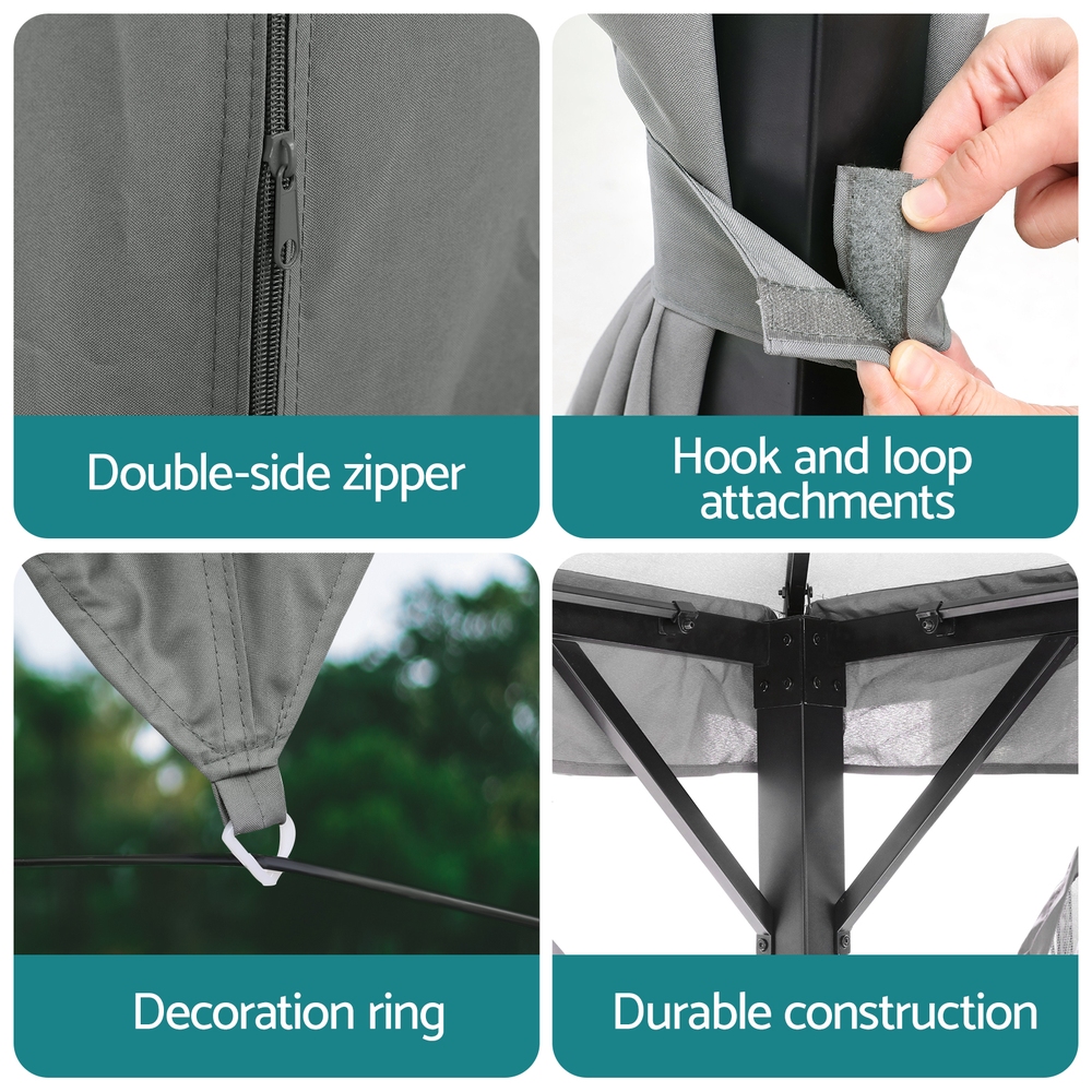 Keep comfortable outdoors year-round with this sturdy Instahut gazebo. Its ventilated double-roof design promotes airflow while the UV-resistant, water-resistant top protects from harsh Aussie sun and light rain. Features practical 8 water leakage holes to prevent pooling. Enjoy bug-free relaxation with full removable flyscreens and curtains, thanks to the dual-track system and double-sided zippers. The heavy-duty powder-coated steel frame ensures stability, while convenient hanging hooks and hook & loop attachments add versatility. Mosquito-proof mesh walls provide reliable insect protection. Sets up to a spacious footprint in classic grey. Constructed from durable steel and polyester.