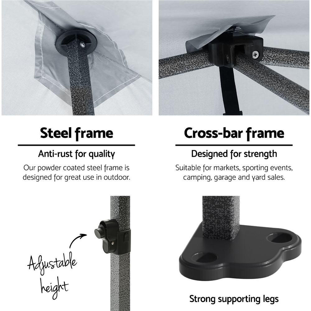 The INSTAHUT gazebo has 3 adjustable height levels to suit different height needs. It is ideal for markets, sporting events, camping, garage and yard sales, school events, trade shows and many more.