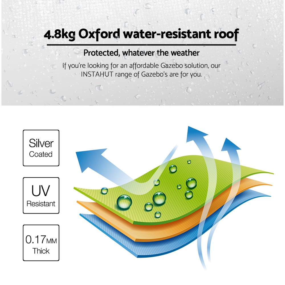 eaturing high density, long lasting PU coating oxford fabric with effective UV and water repellent treatments, this INSTAHUT 4.5×3 Pop Up Gazebo provides a lovely ground and canopy coverage of 450 x 300cm. It is perfect for all your upcoming outdoor activities, as a sunshade station as well as a shelter for unexpected rains.