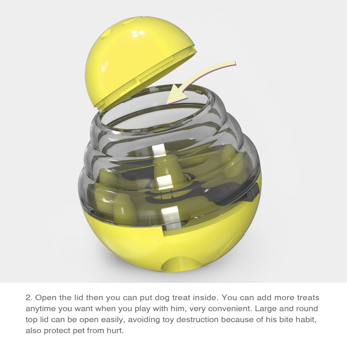 • Easy-Fill Lid: Large round top opens for quick treat reloading
