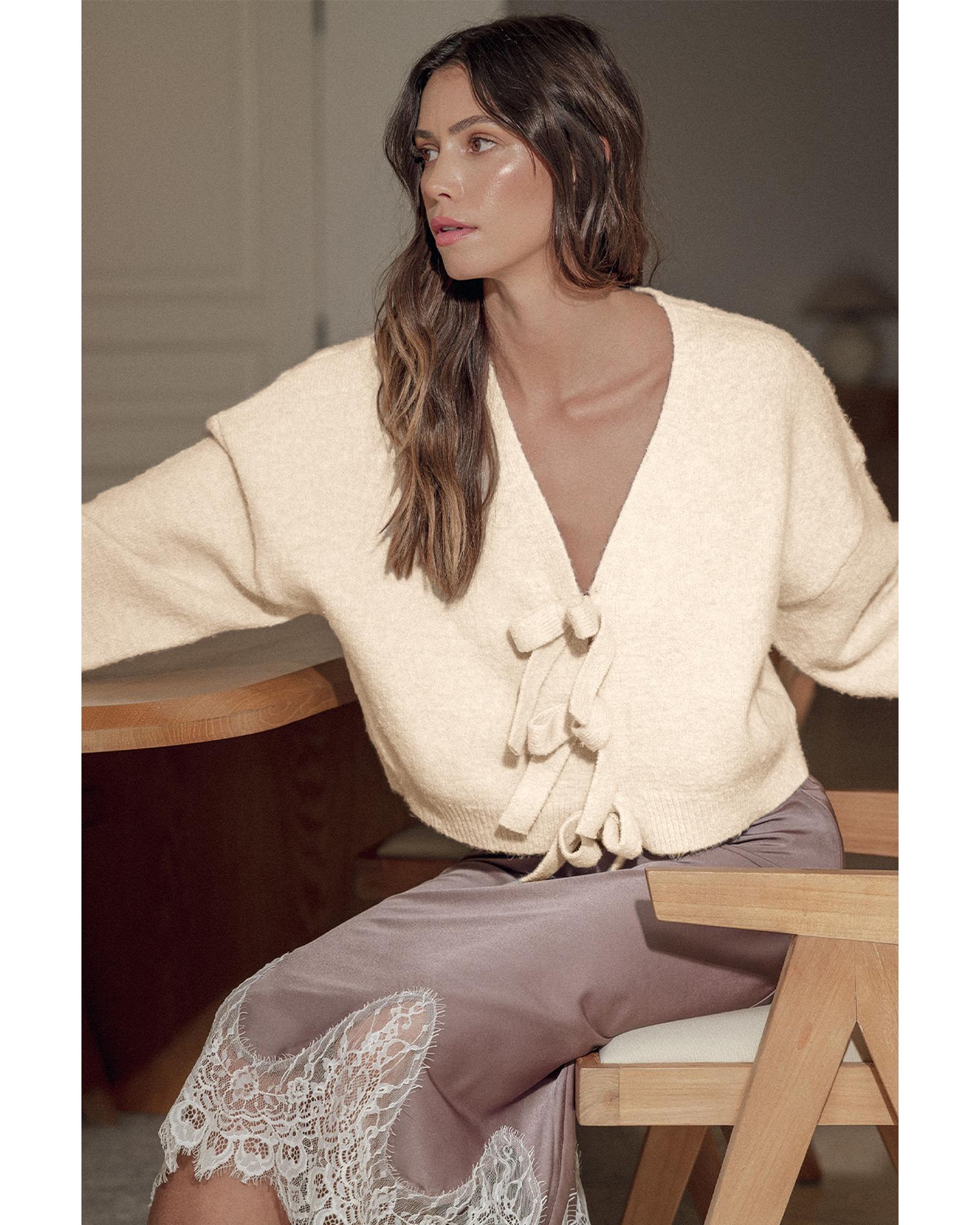 Jet Stream Bowknot Front Loose V Neck Knitted Cardigan – M
