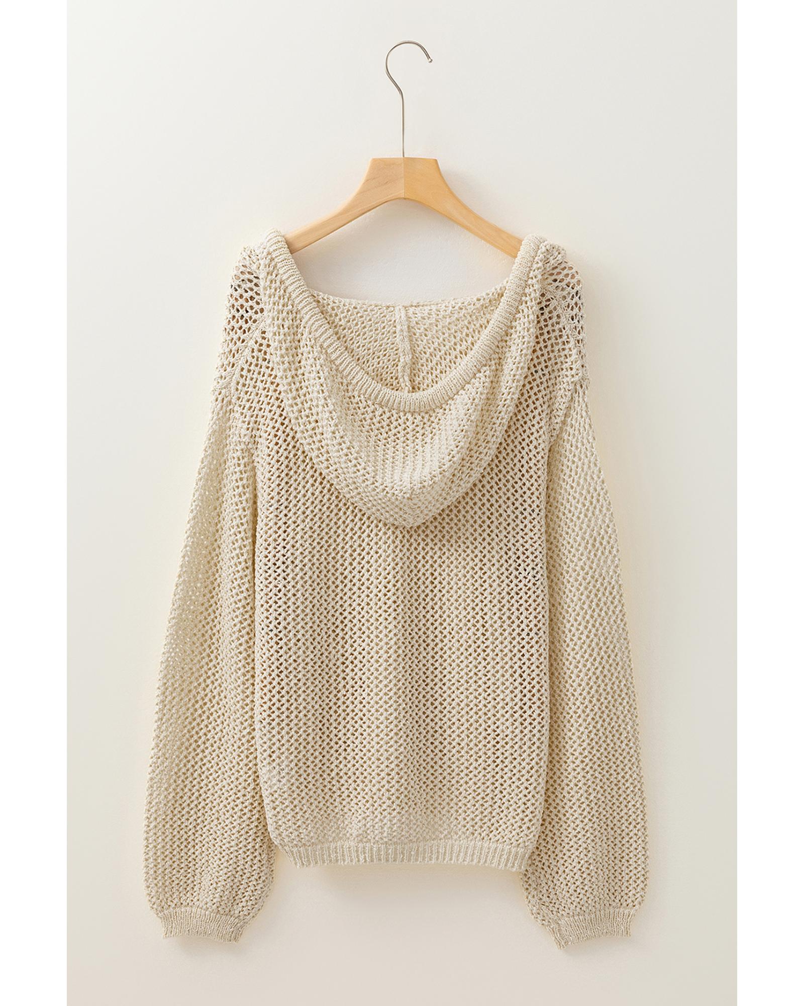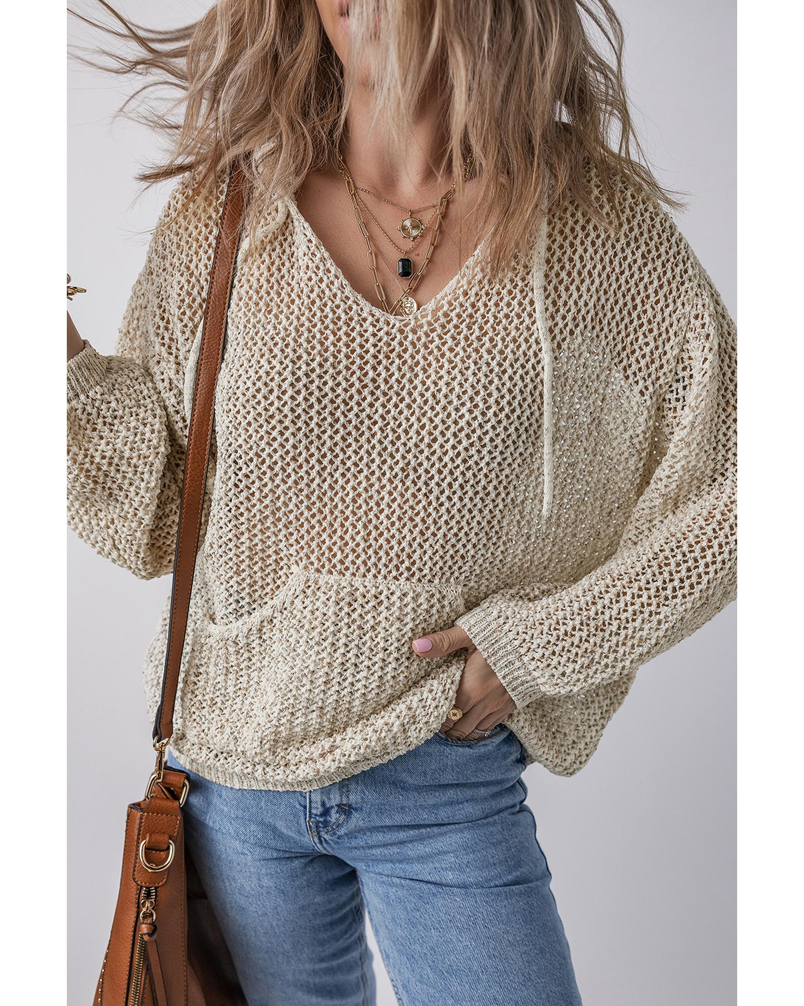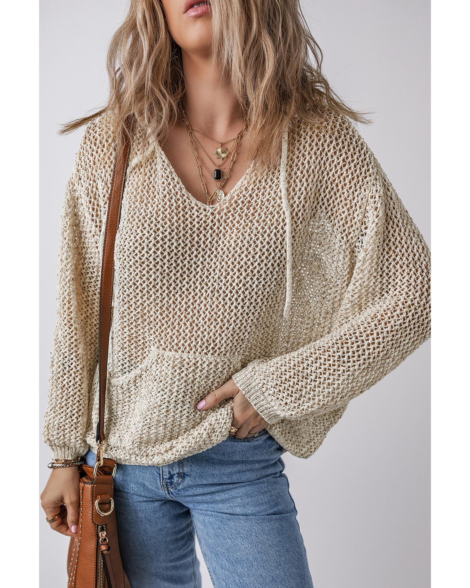 Jet Stream Hollow-out Kangaroo Pocket V Neck Hooded Sweater – M
