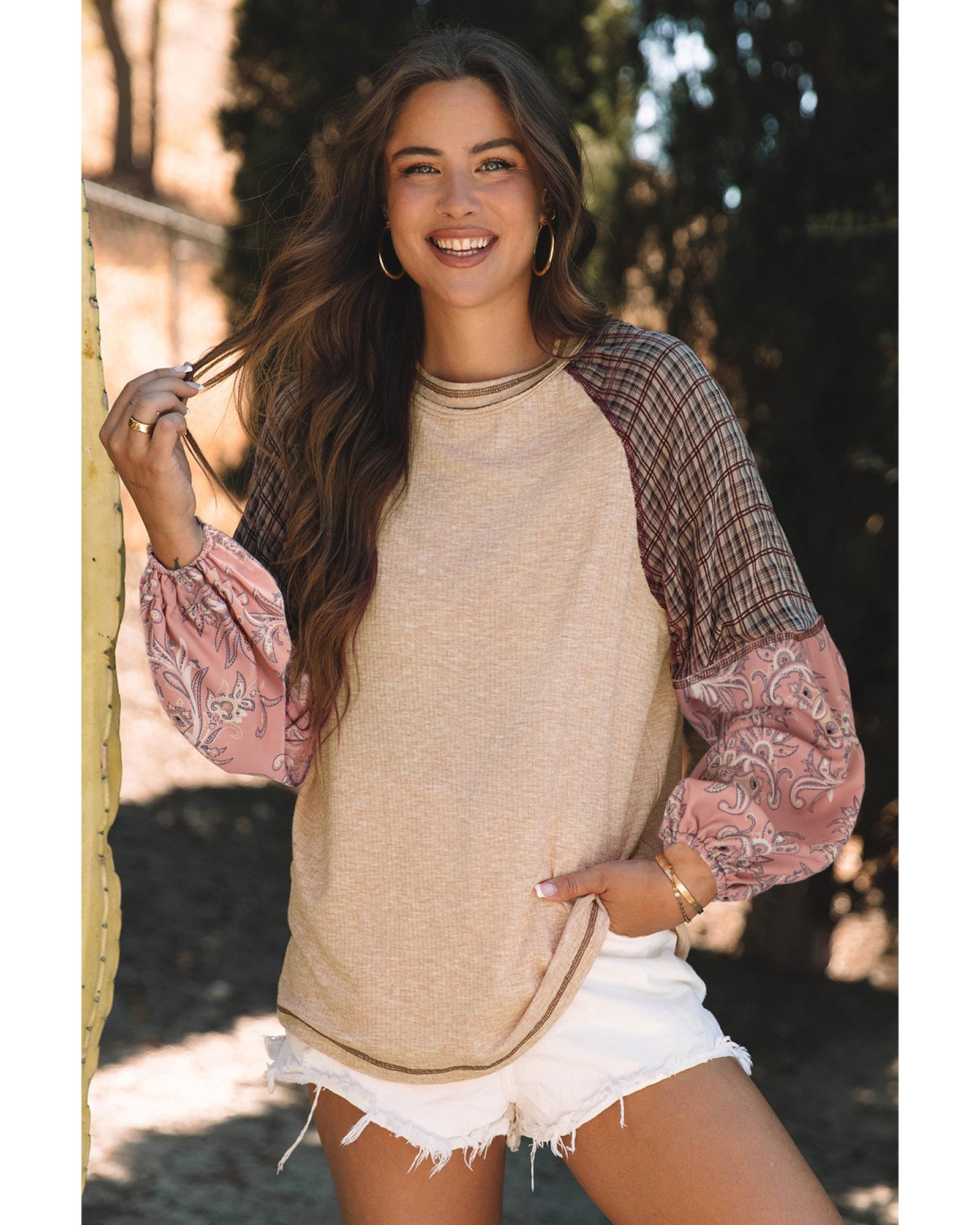 Coffee Ruffled Floral Sleeve Patchwork Waffle Knit O Neck Blouse - L