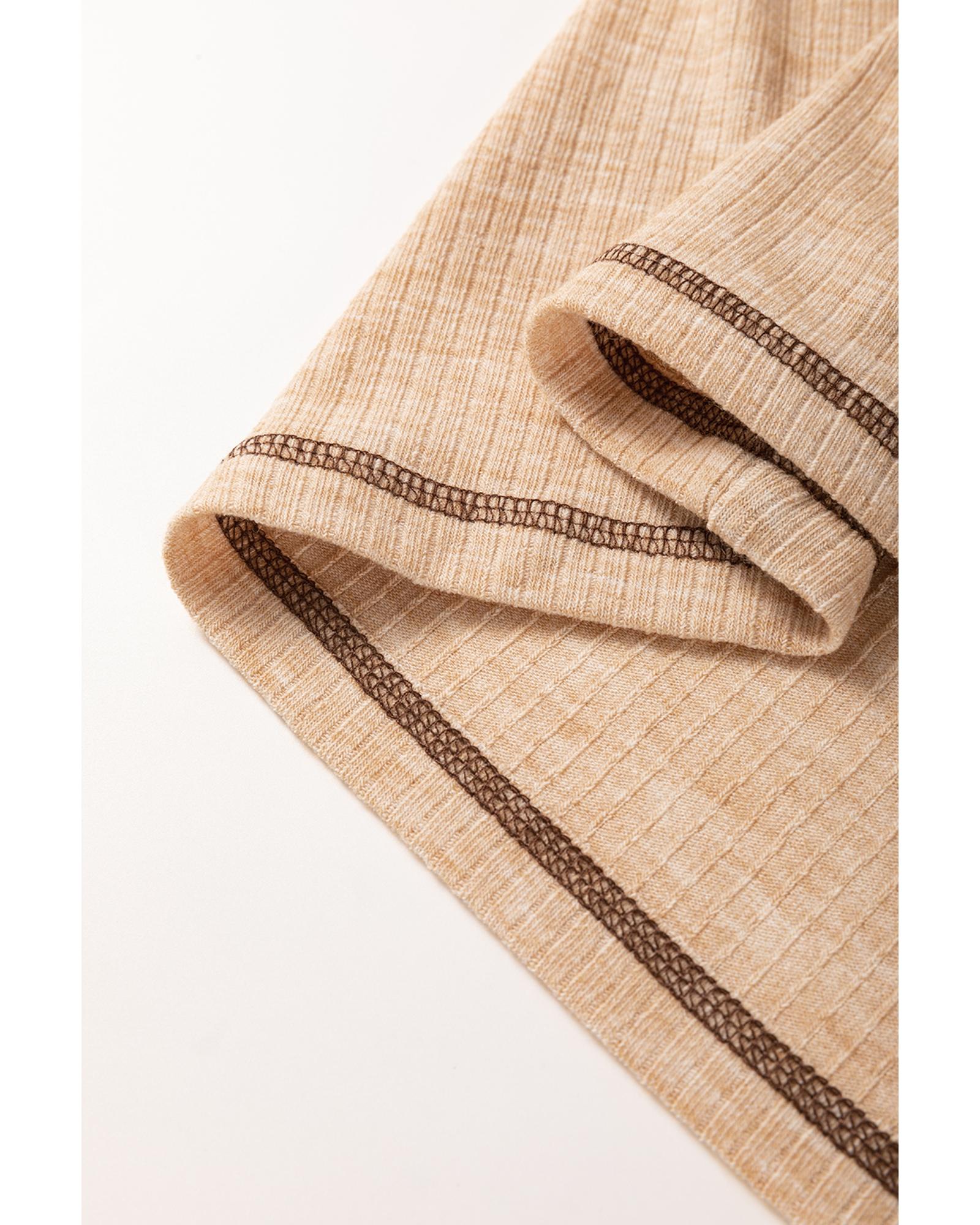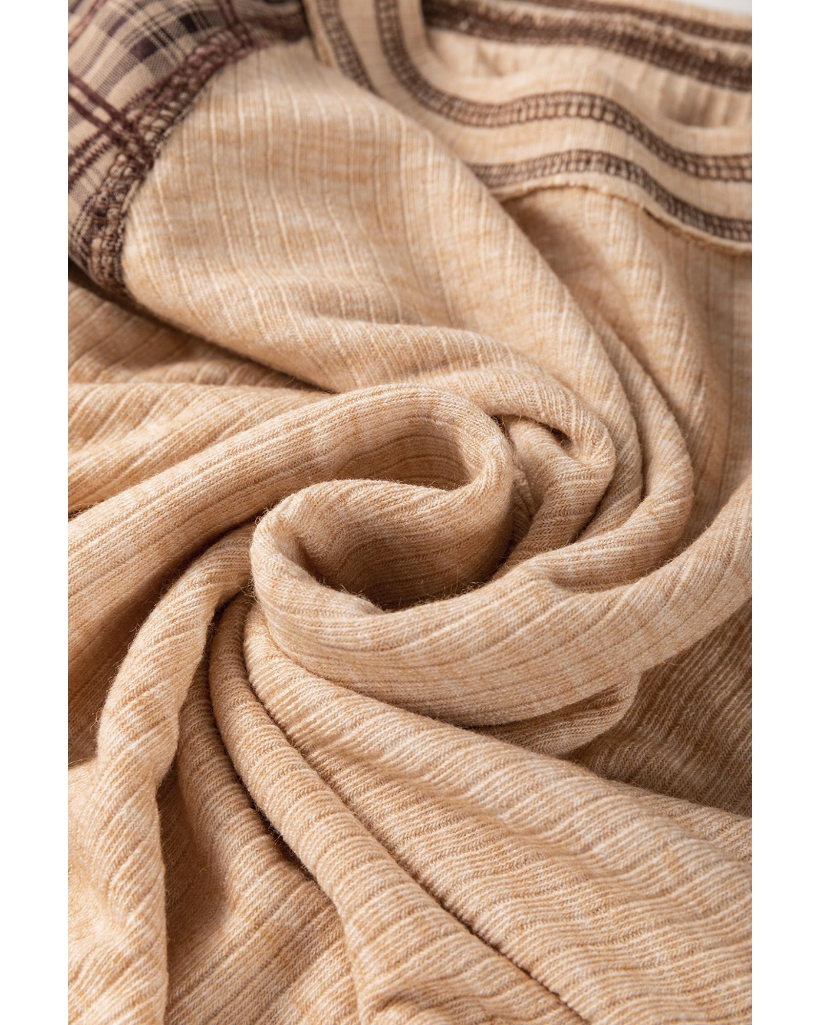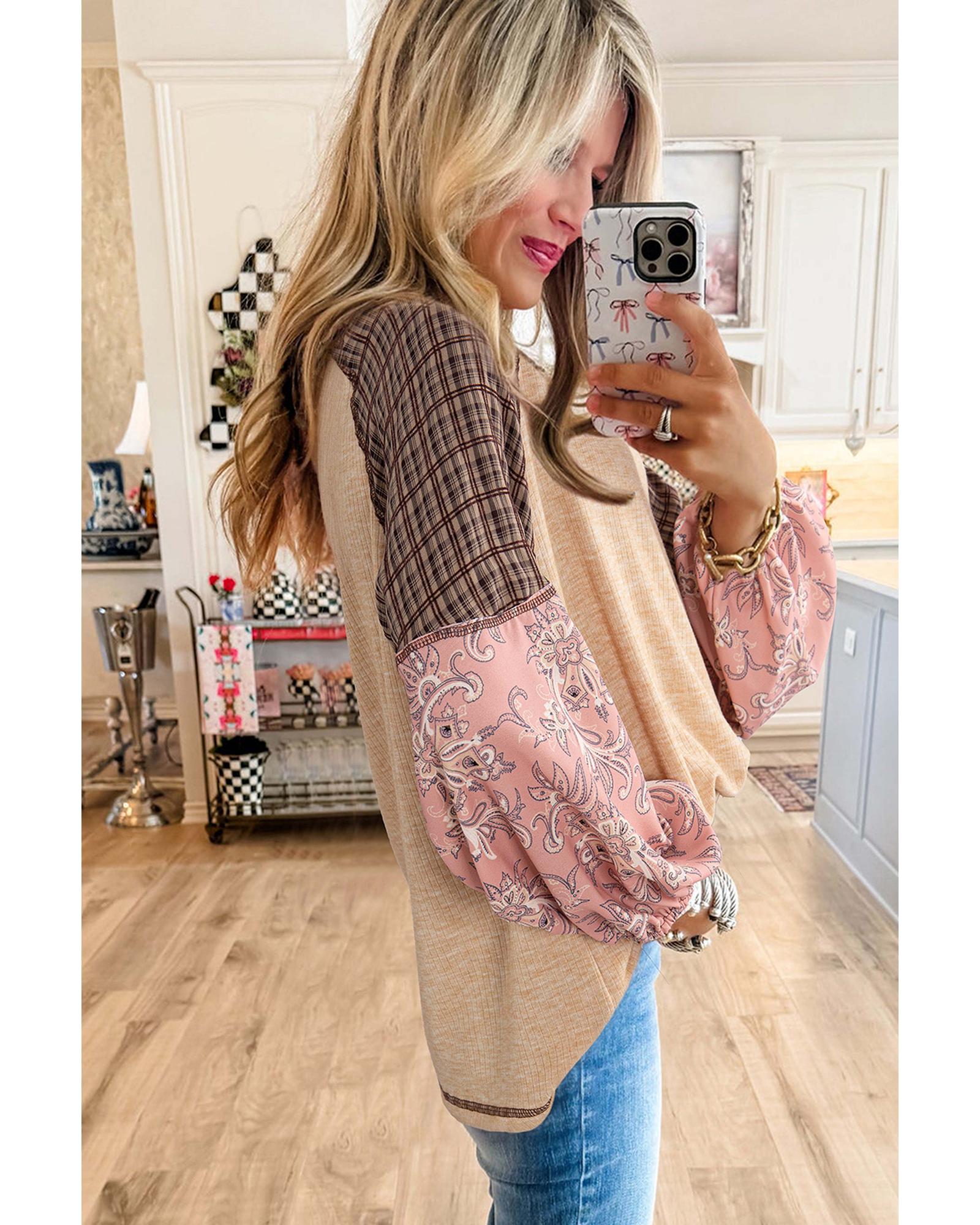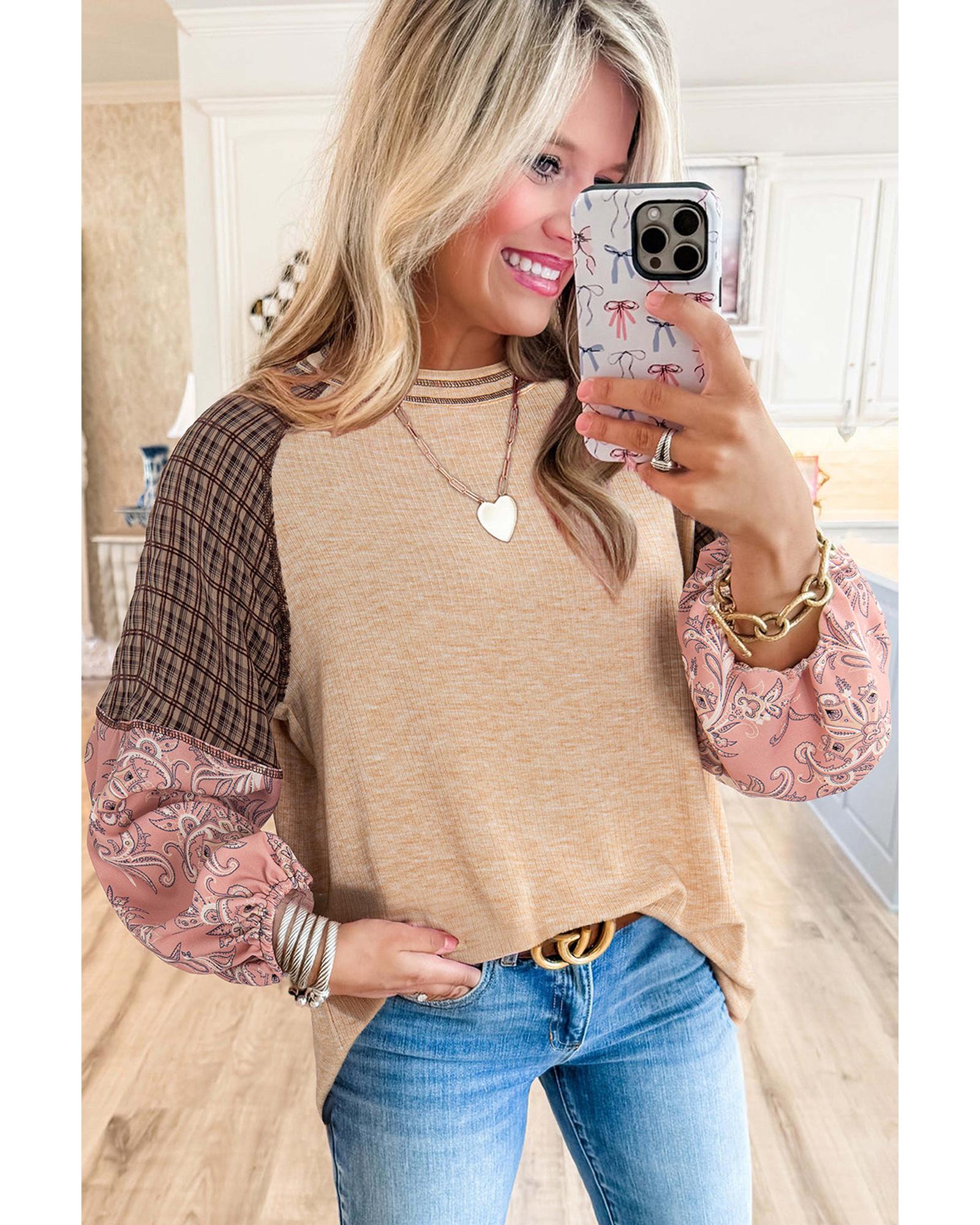 Coffee Ruffled Floral Sleeve Patchwork Waffle Knit O Neck Blouse - S