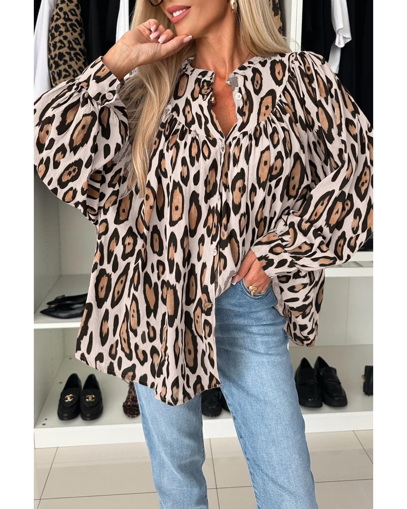 Jet Stream Oversized Leopard Print Balloon Sleeve Casual Shirt – L