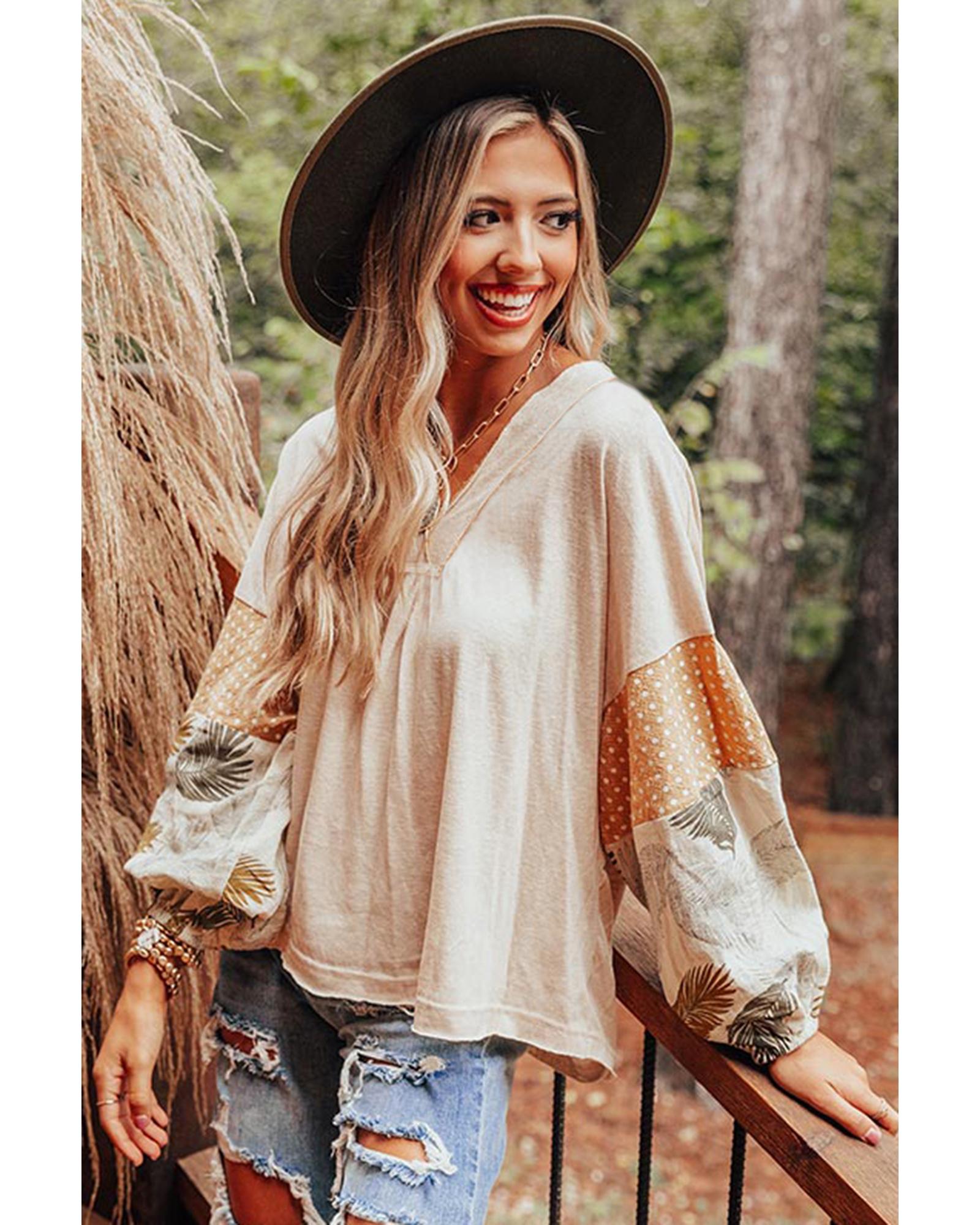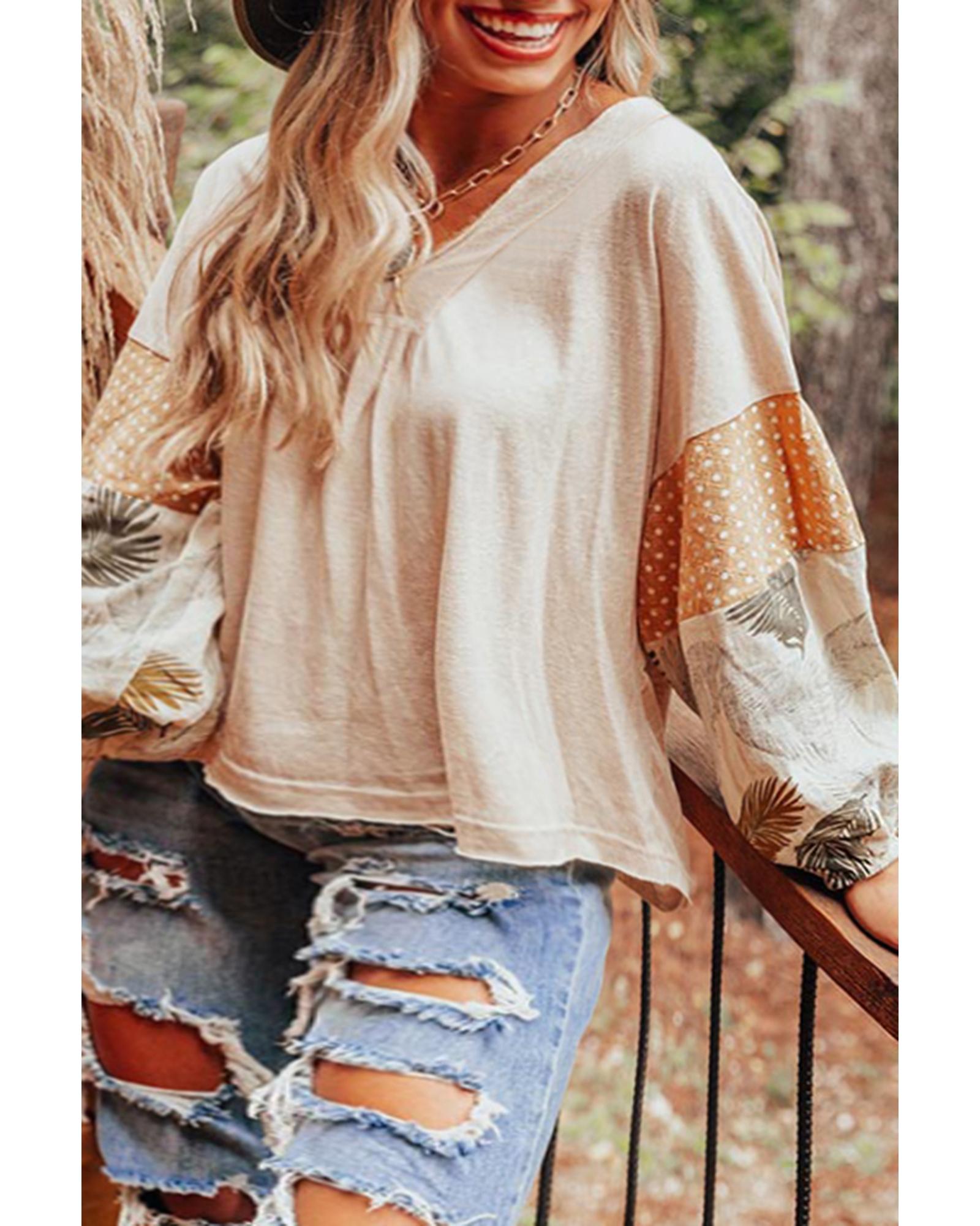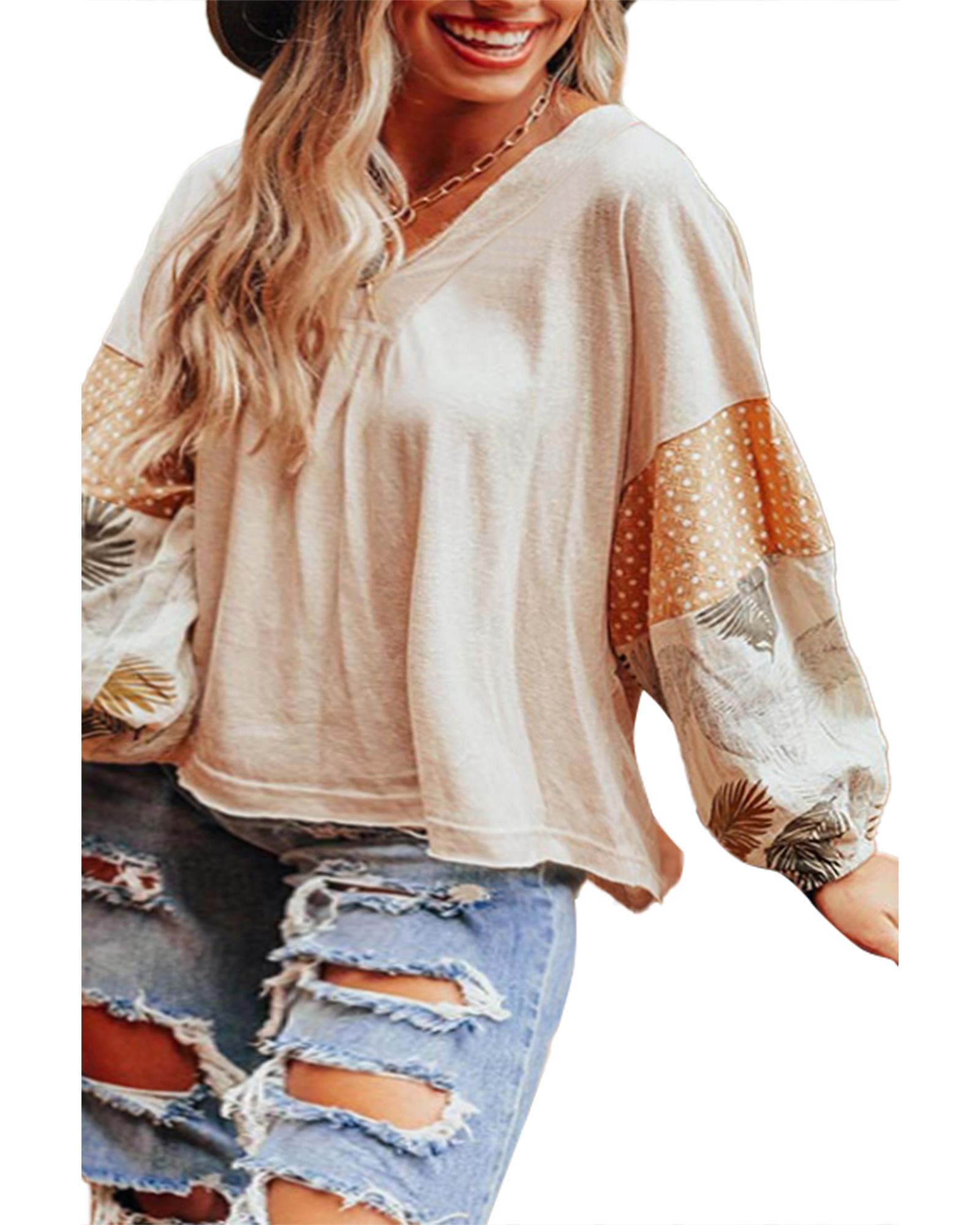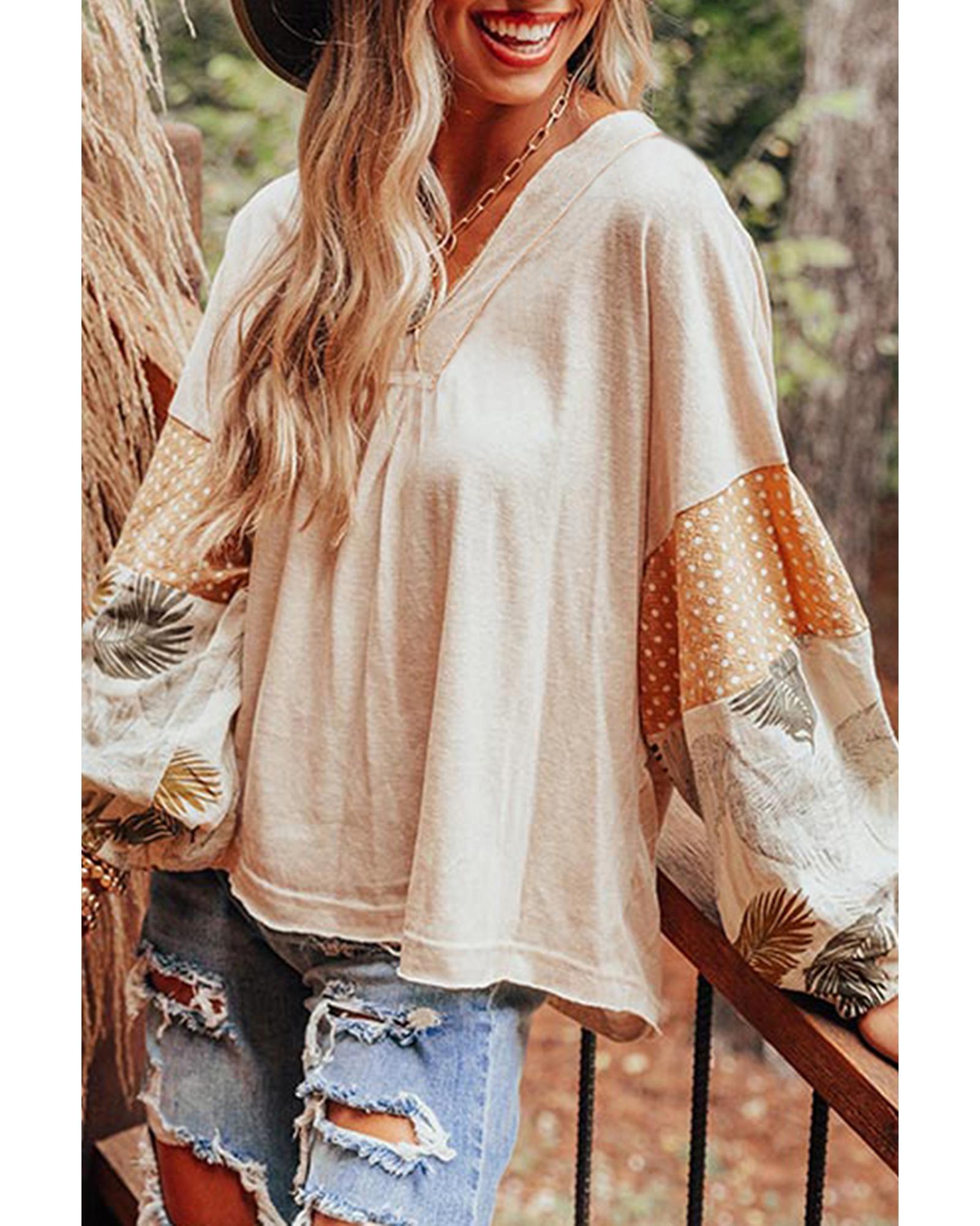 Jet Stream Palm Leaves Polka Dot Puff Sleeve Patchwork V Neck Loose Blouse – XL