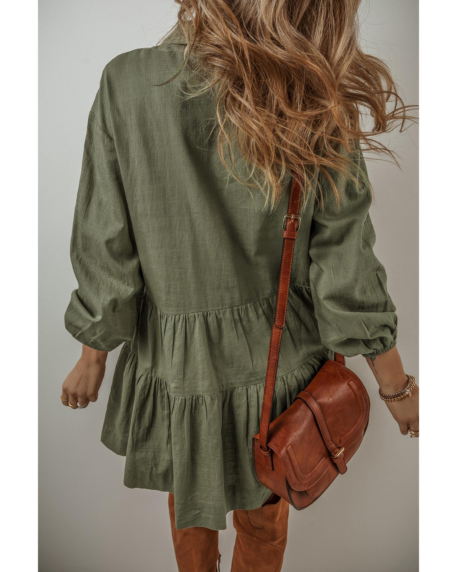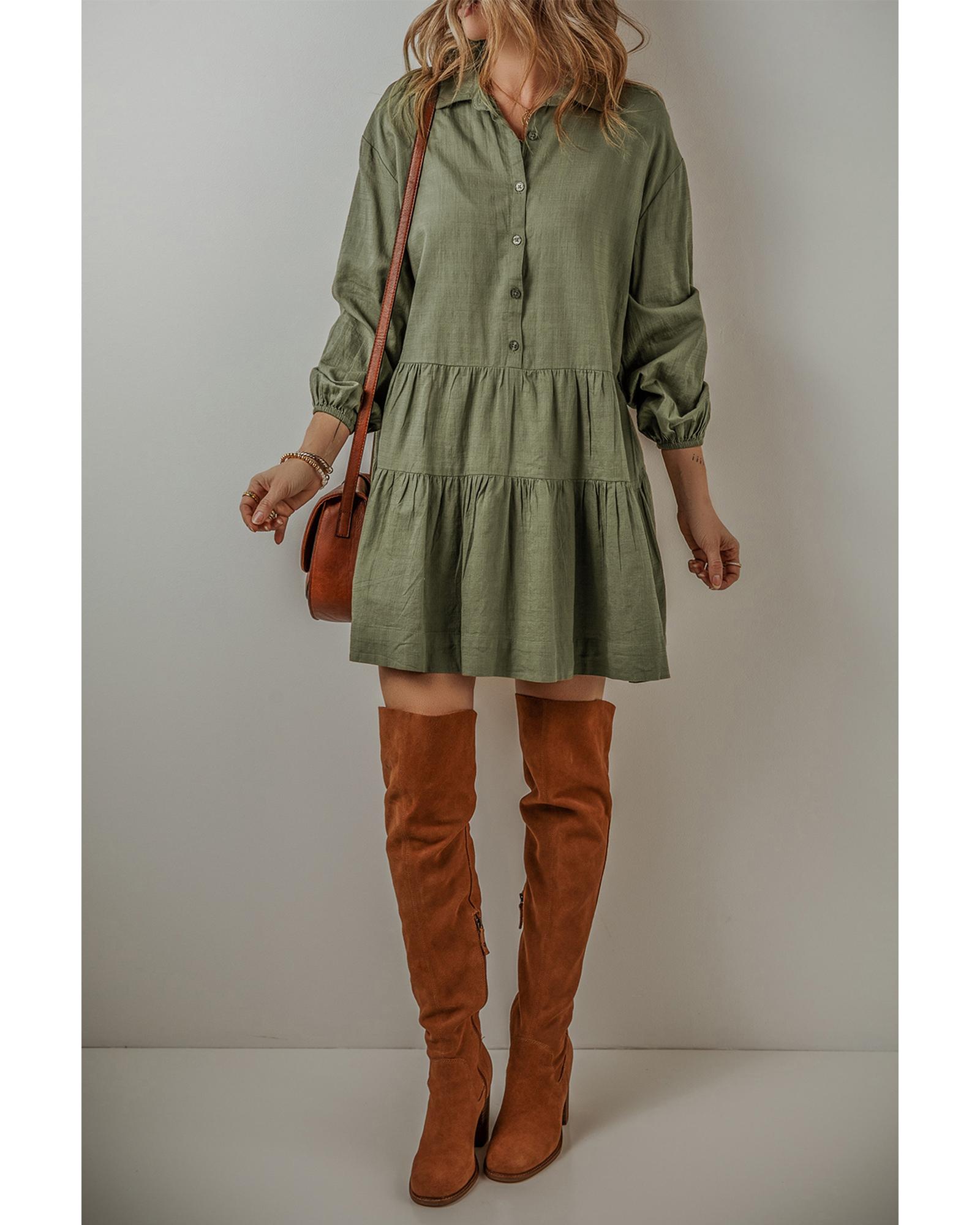 Jungle Green Puff Sleeve Buttoned Tiered Pleated Shirt Mini Dress – XL