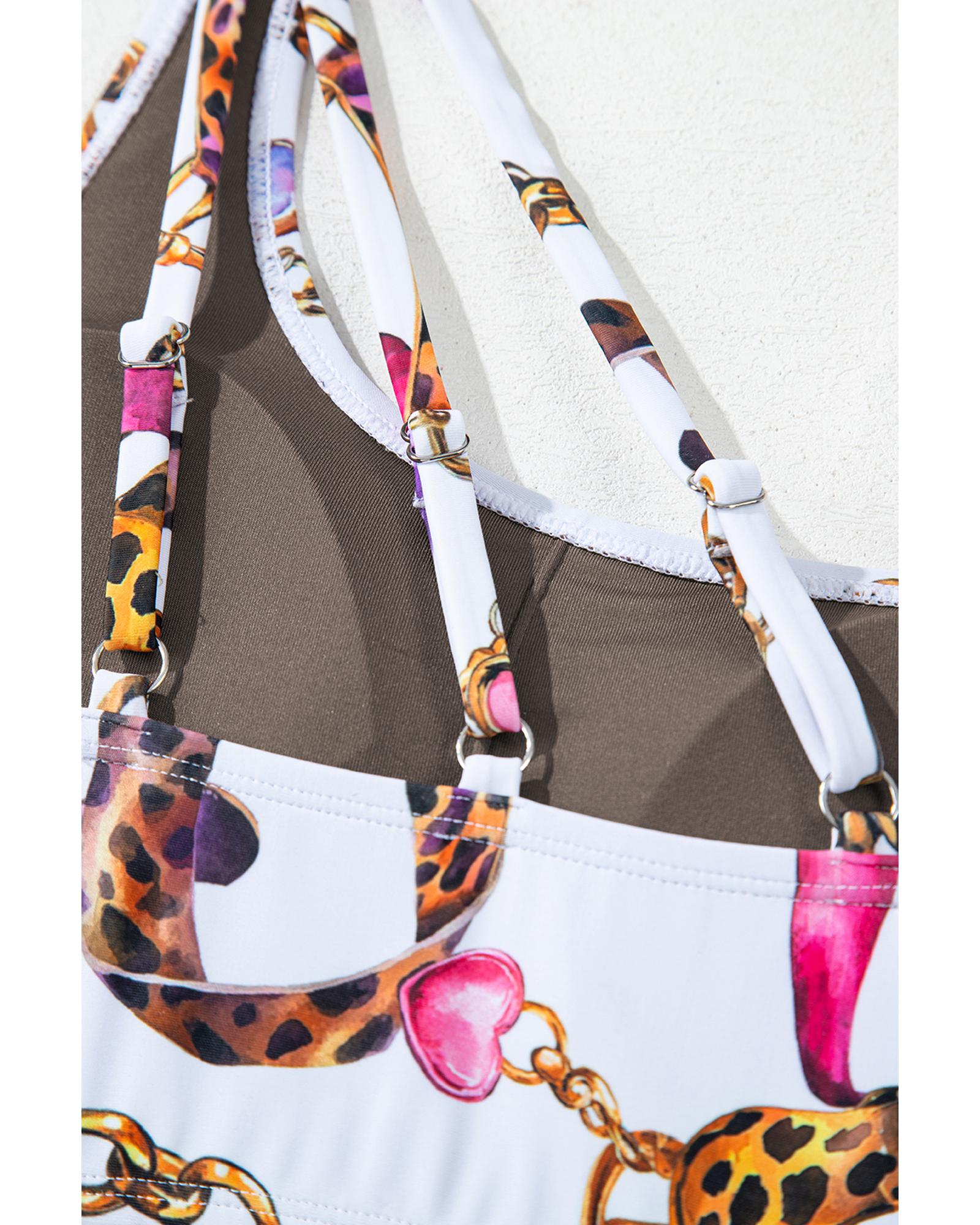 Khaki Abstract Print One Shoulder Ring Linked High Waist Bikini – M