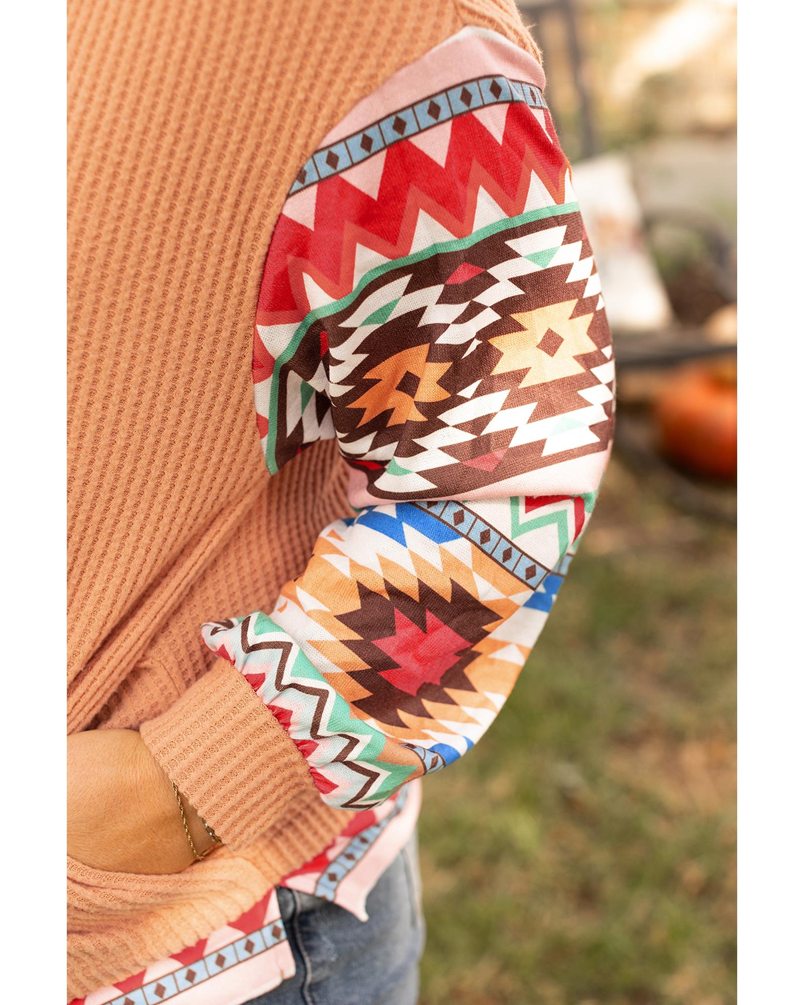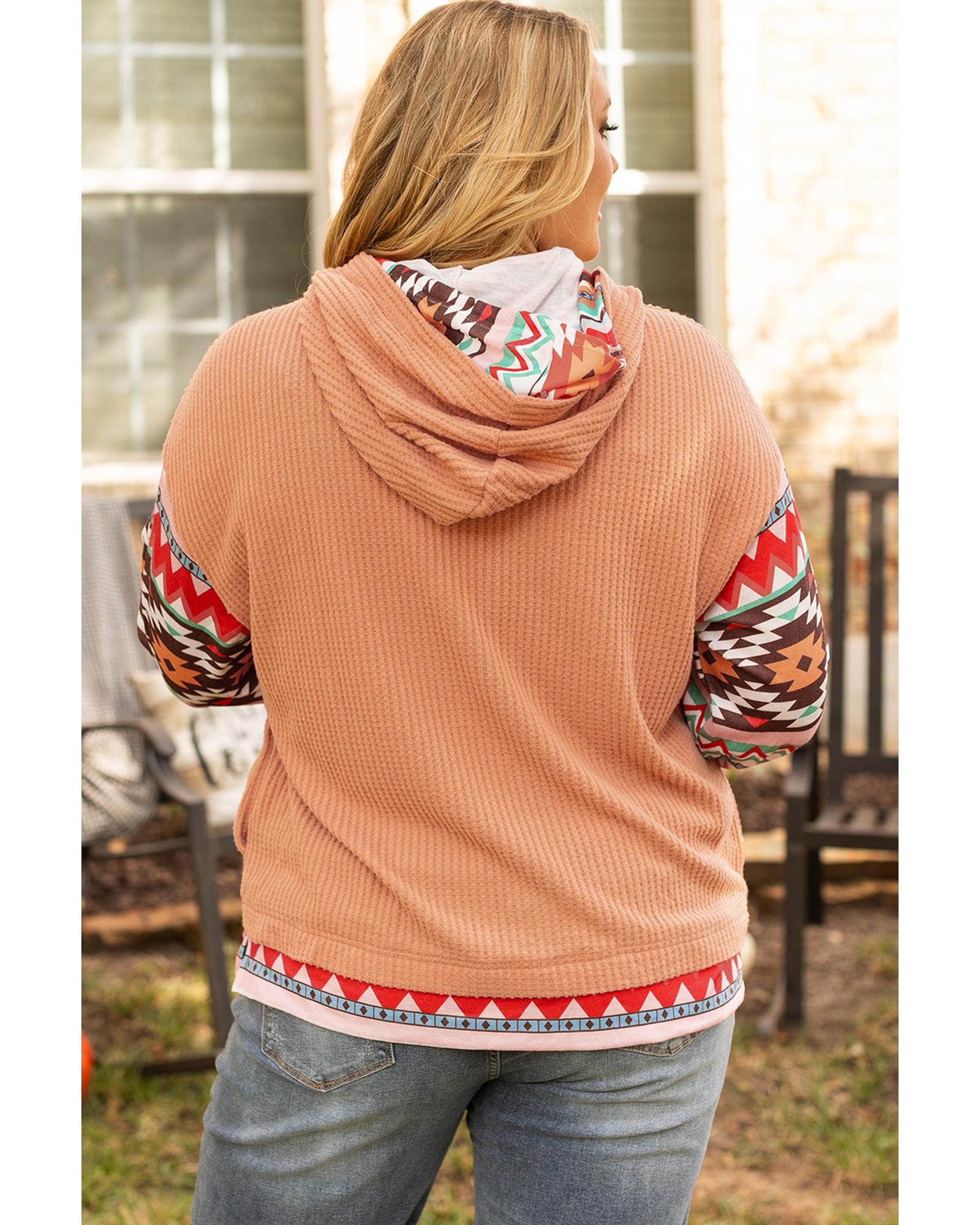 Khaki Aztec Patchwork Waffle Knit Plus Size Hoodie – 3X
