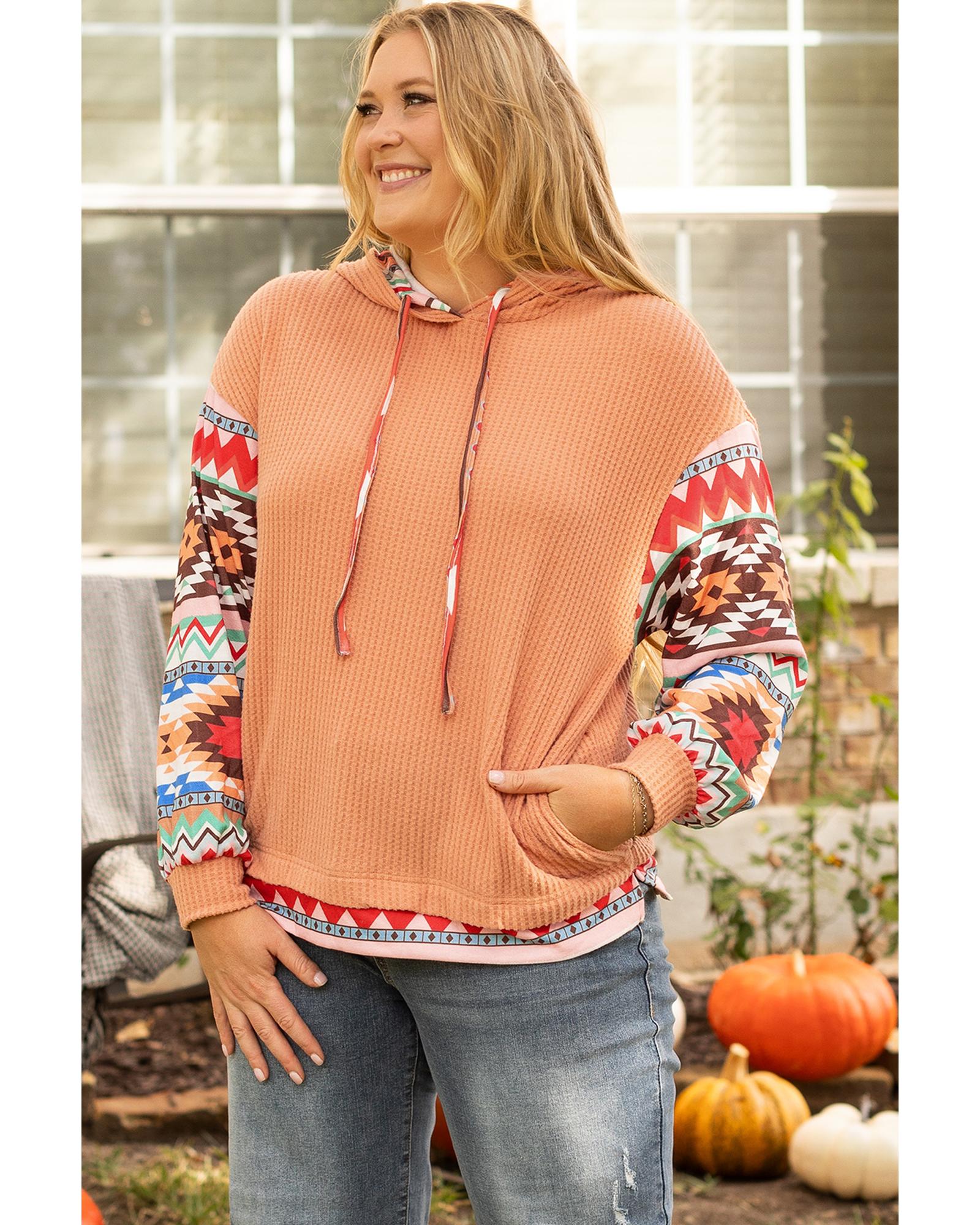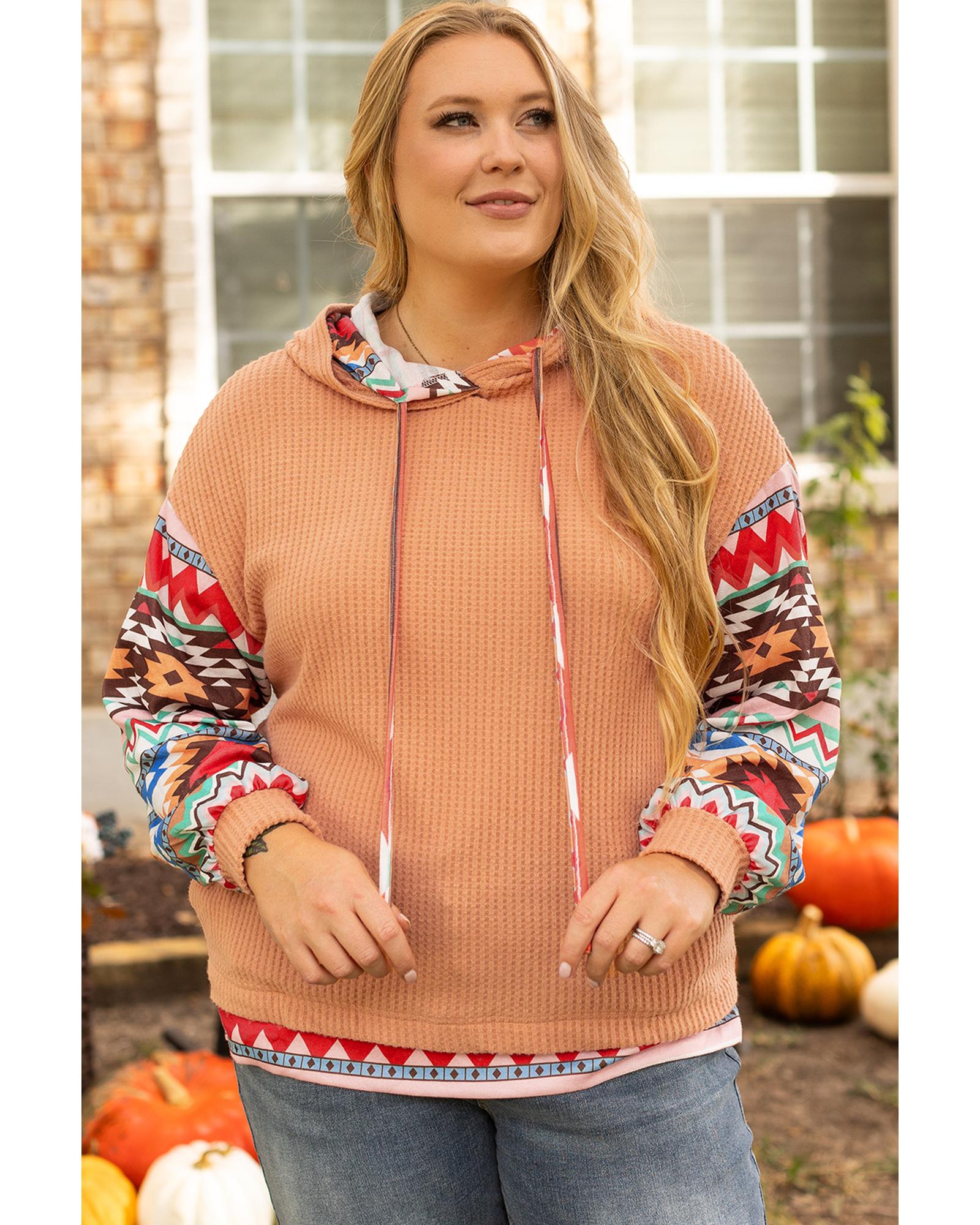 Khaki Aztec Patchwork Waffle Knit Plus Size Hoodie – 4X