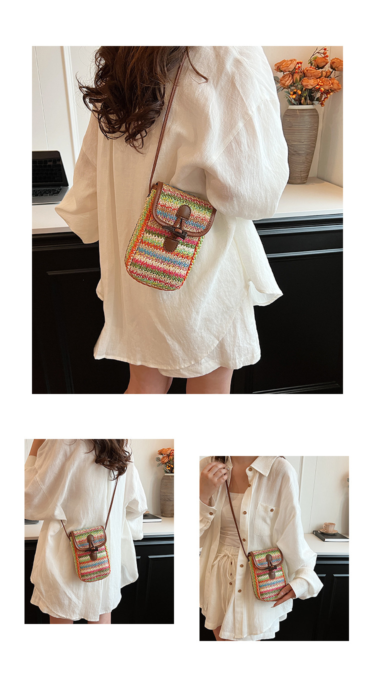 Khaki Boho Chic Woven Straw Crossbody Bag – Colourful Striped Mini Phone Pouch with Toggle Closure