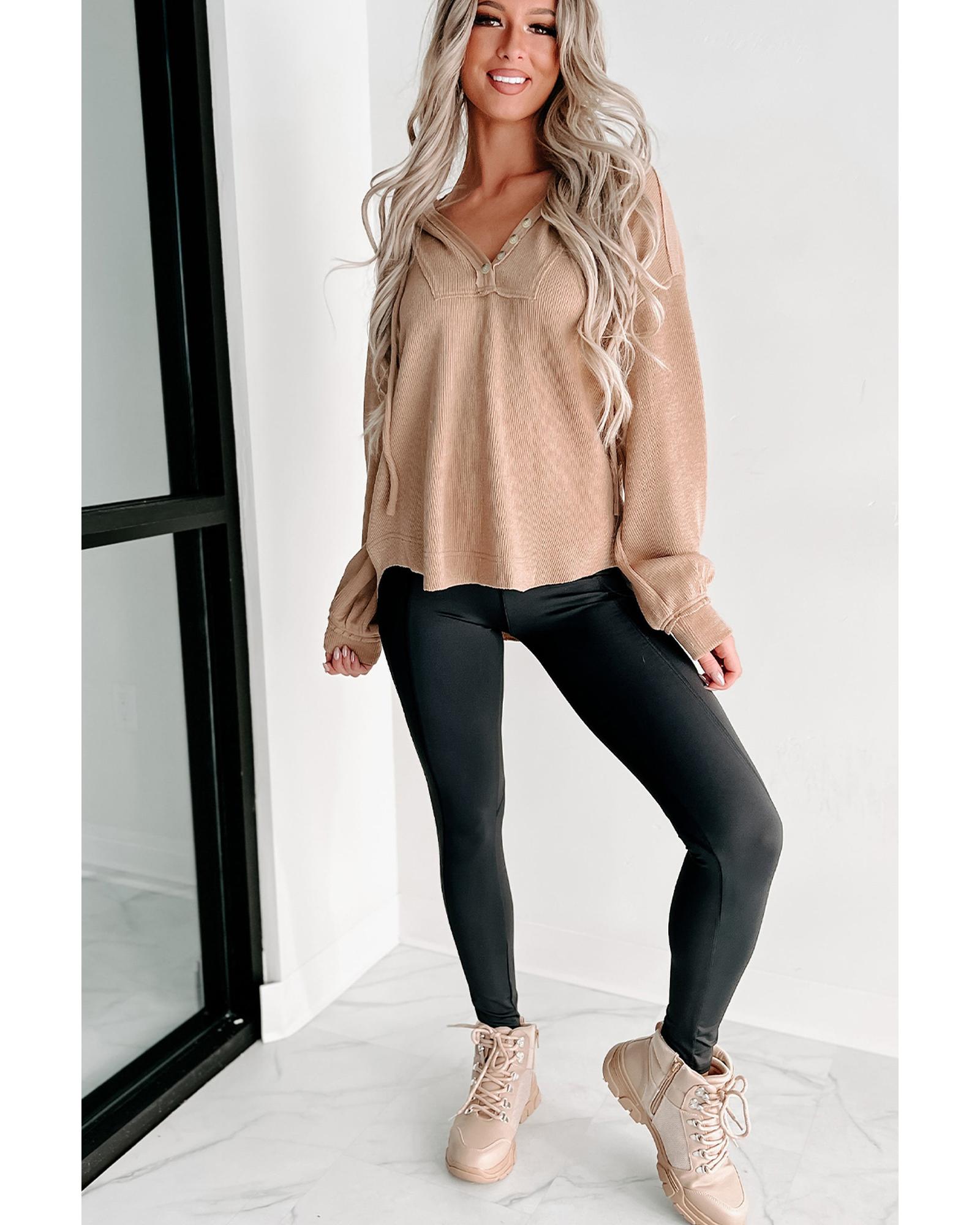 Khaki Buttoned V Neck Drawstring Knit Hoodie – M