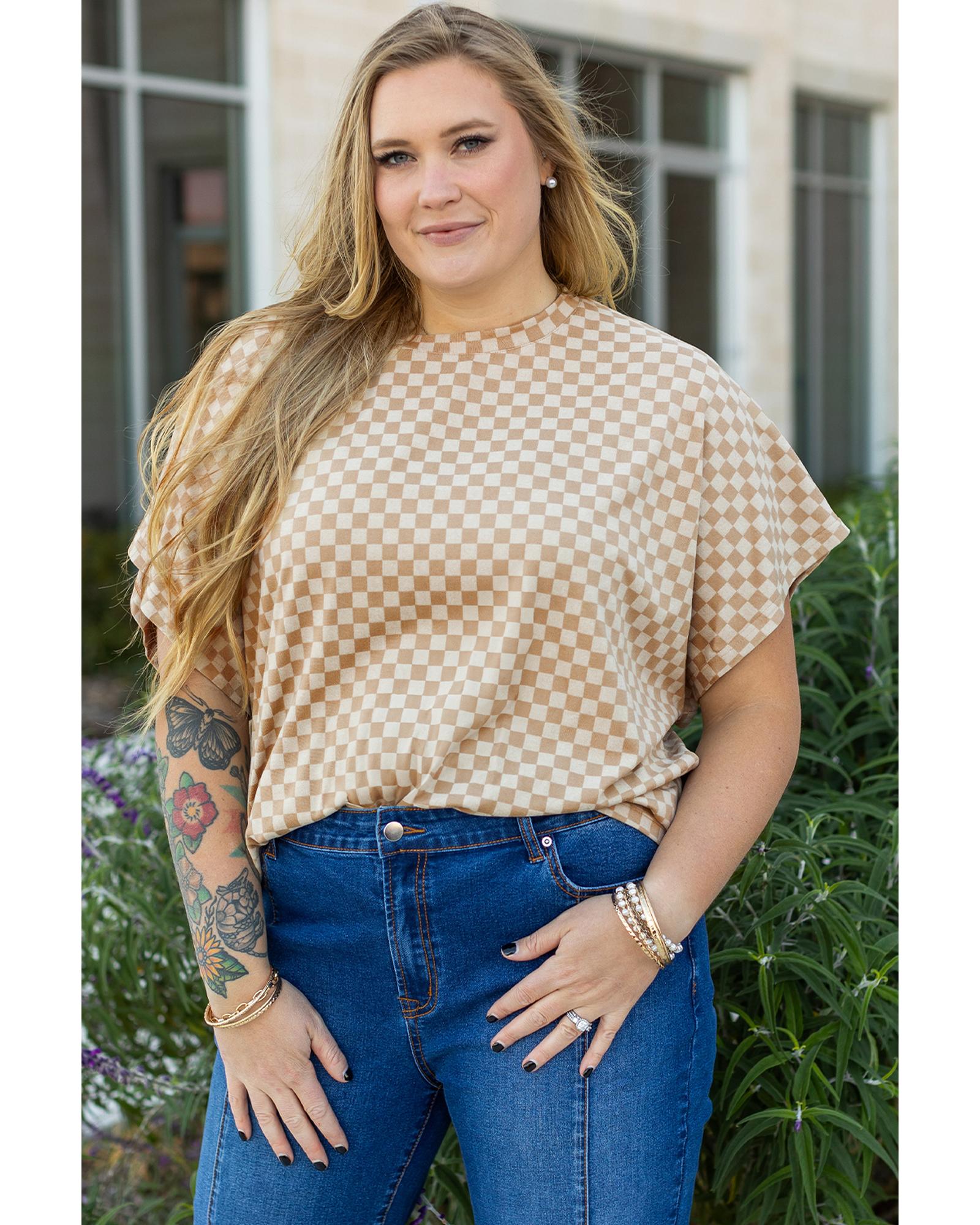 Khaki Checkerboard Short Batwing Sleeve Round Neck Plus Size T Shirt – 4X