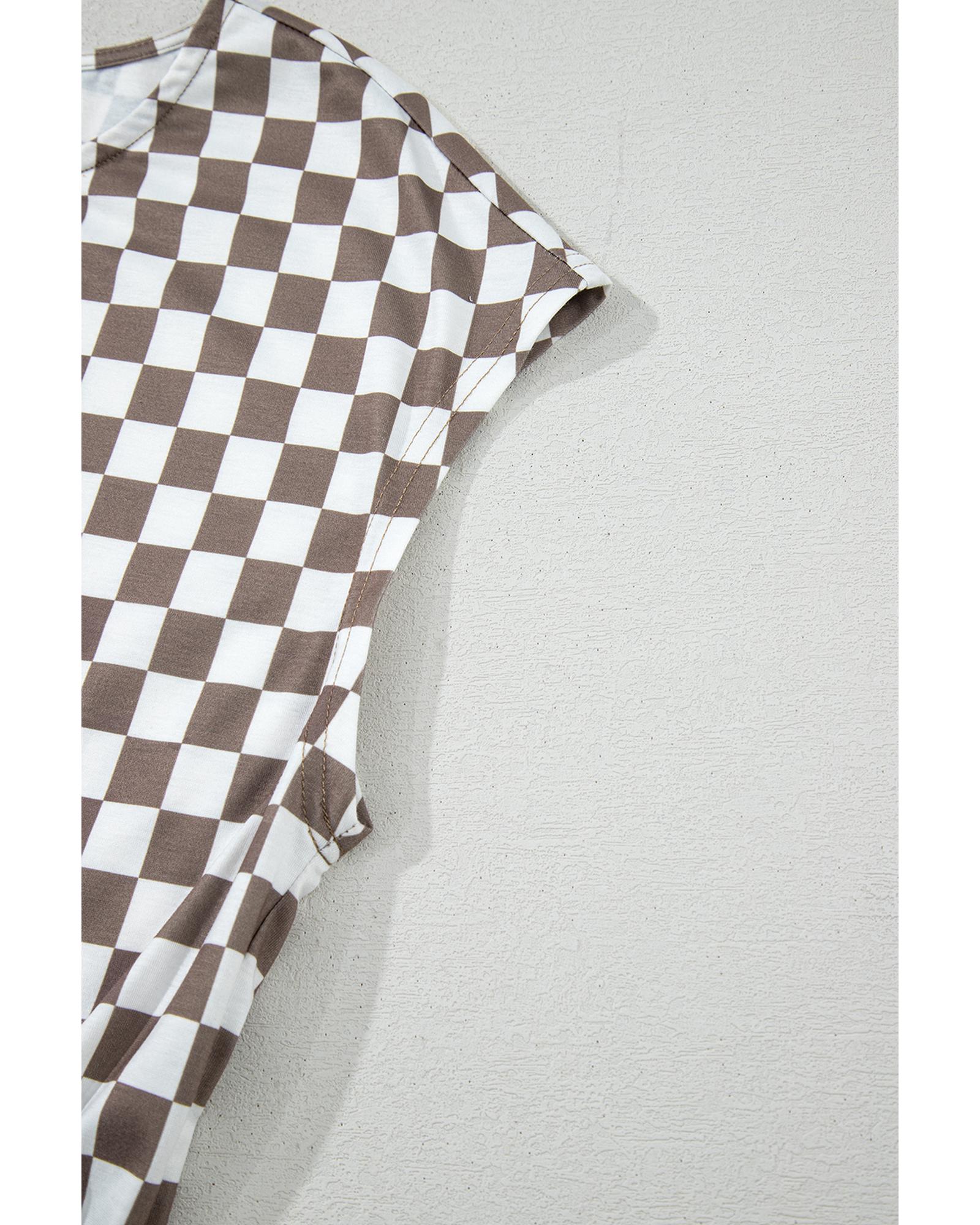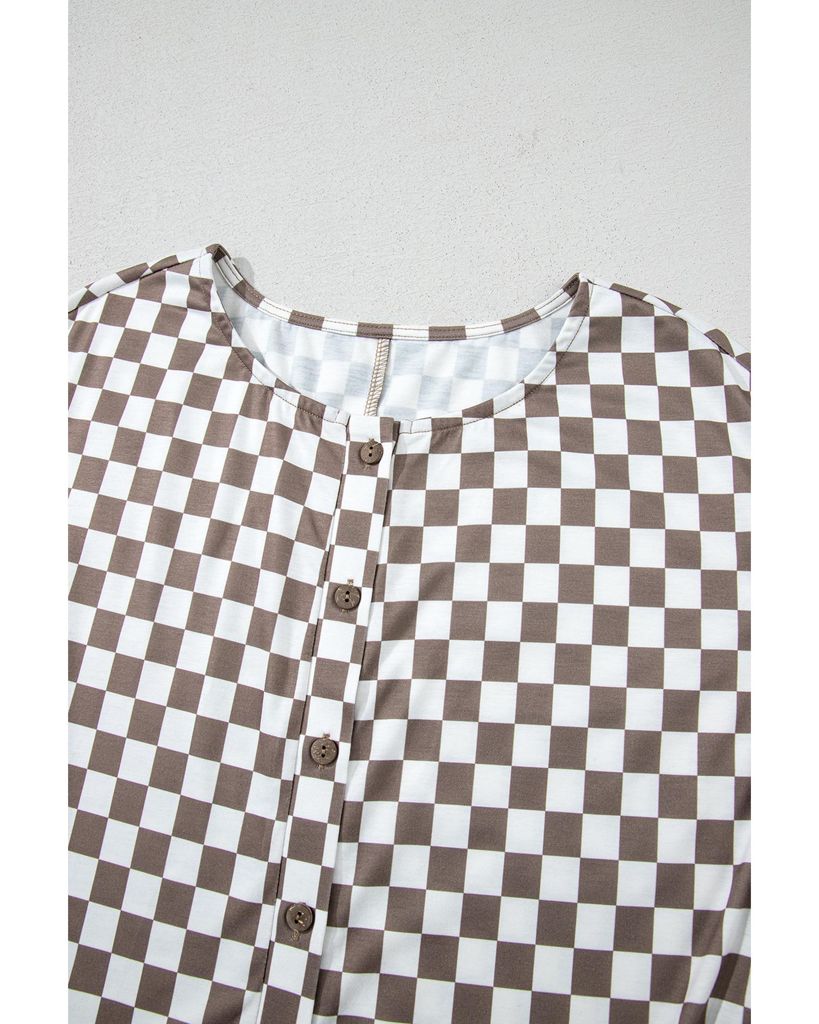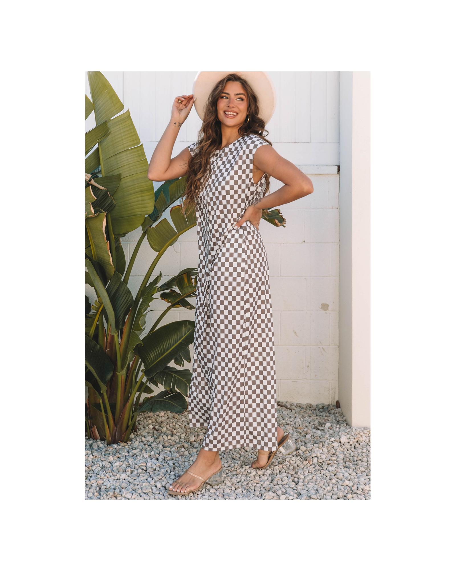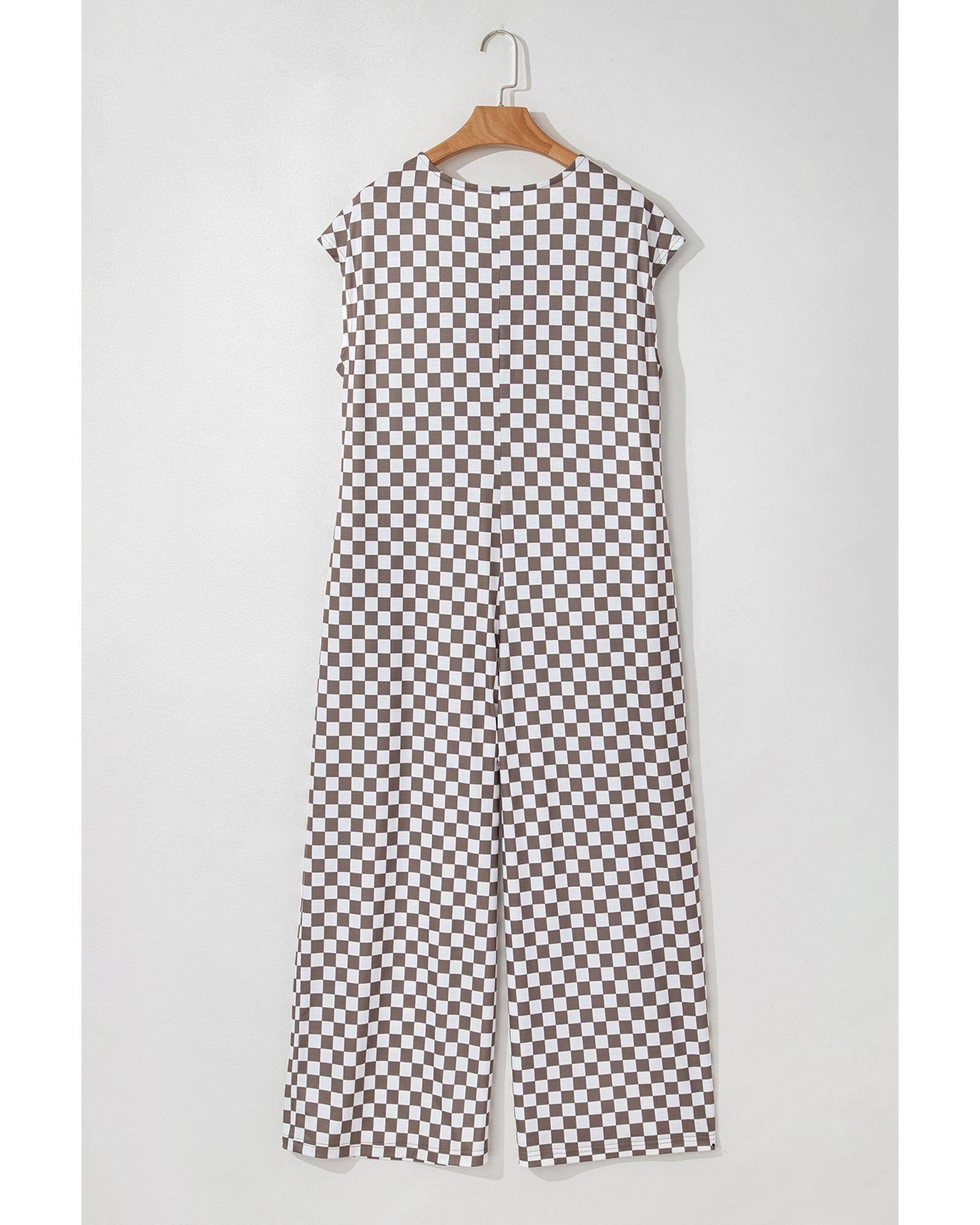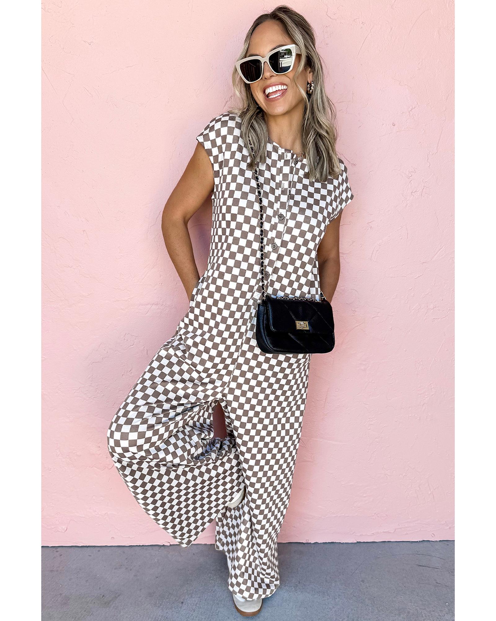 Khaki Checkered Print Buttoned Crew Neck Wide Leg Jumpsuit – XL