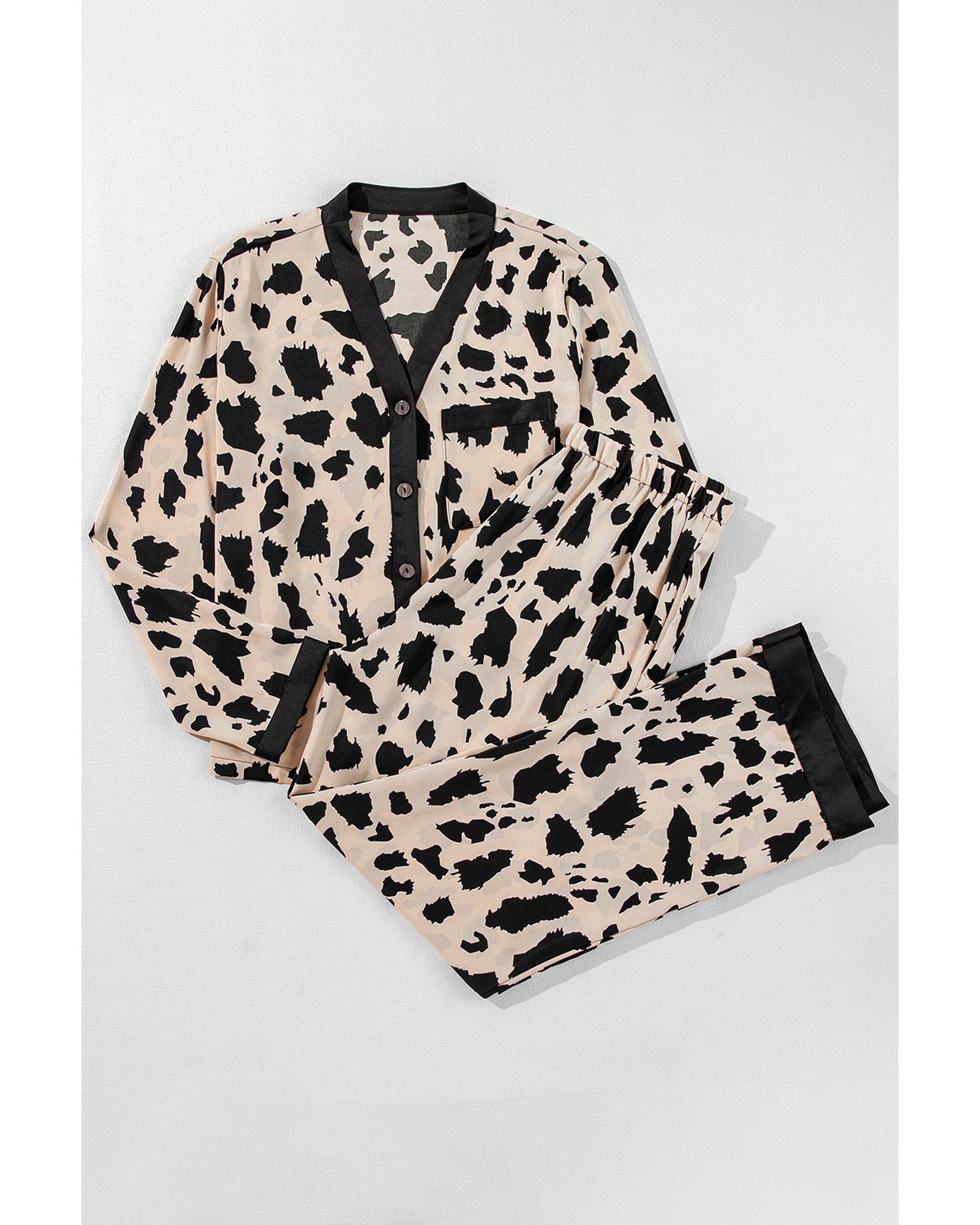 Khaki Cheetah Contrast Trim Loose Fit Two Piece Sleepwear – S