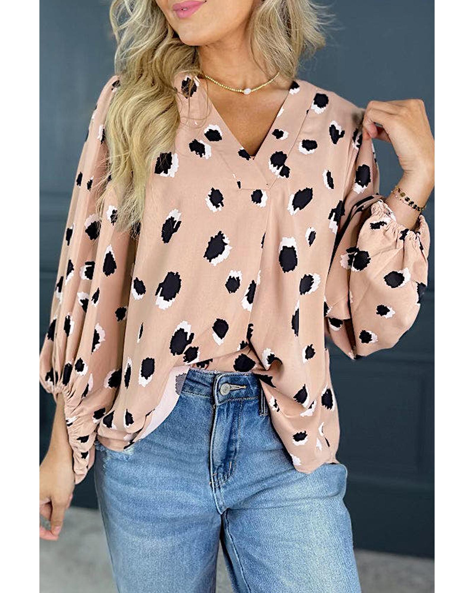Khaki Classic Leopard V Neck Bracelet Sleeve Blouse – S