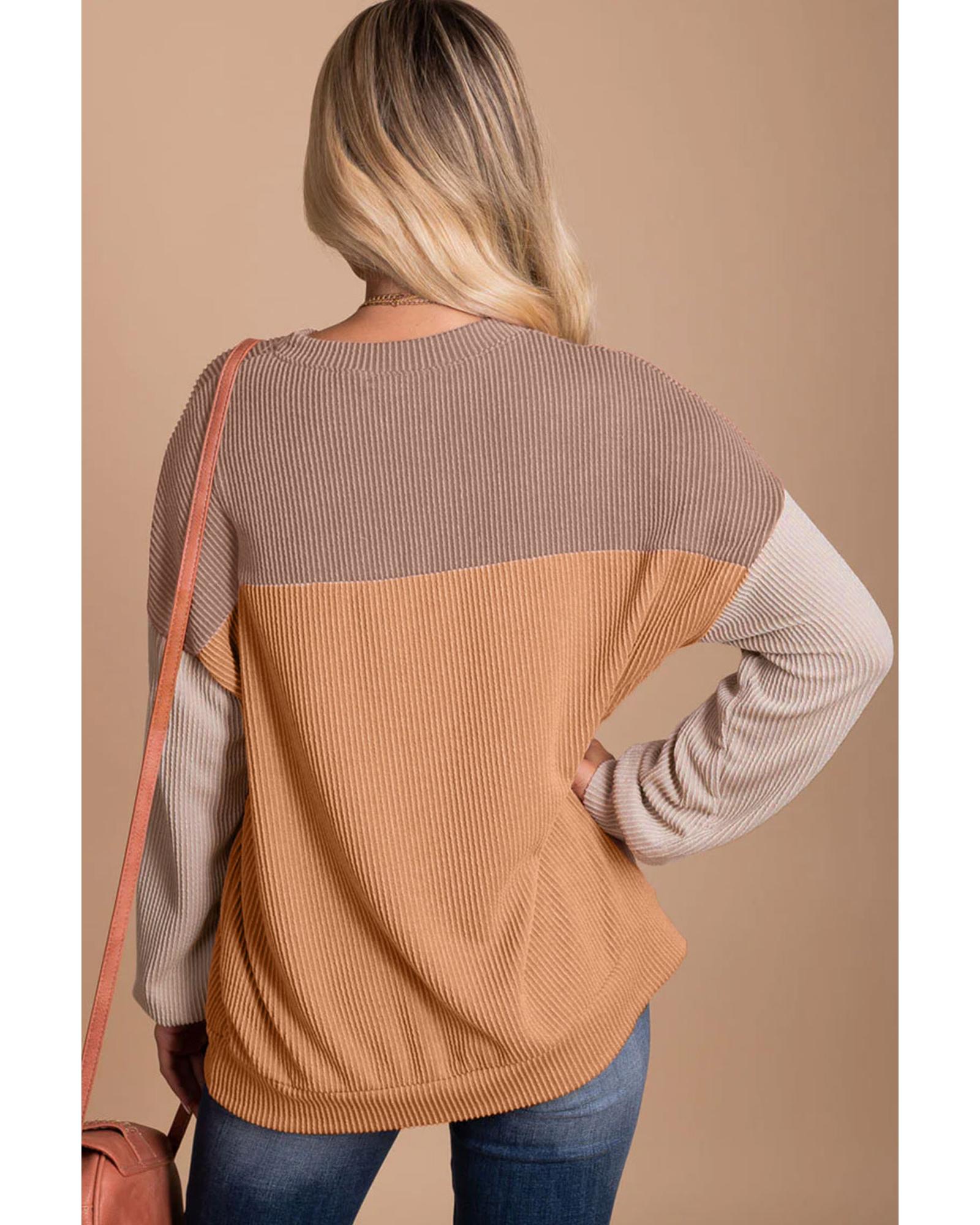 Khaki Color Block Long Sleeve Ribbed Loose Top – XL