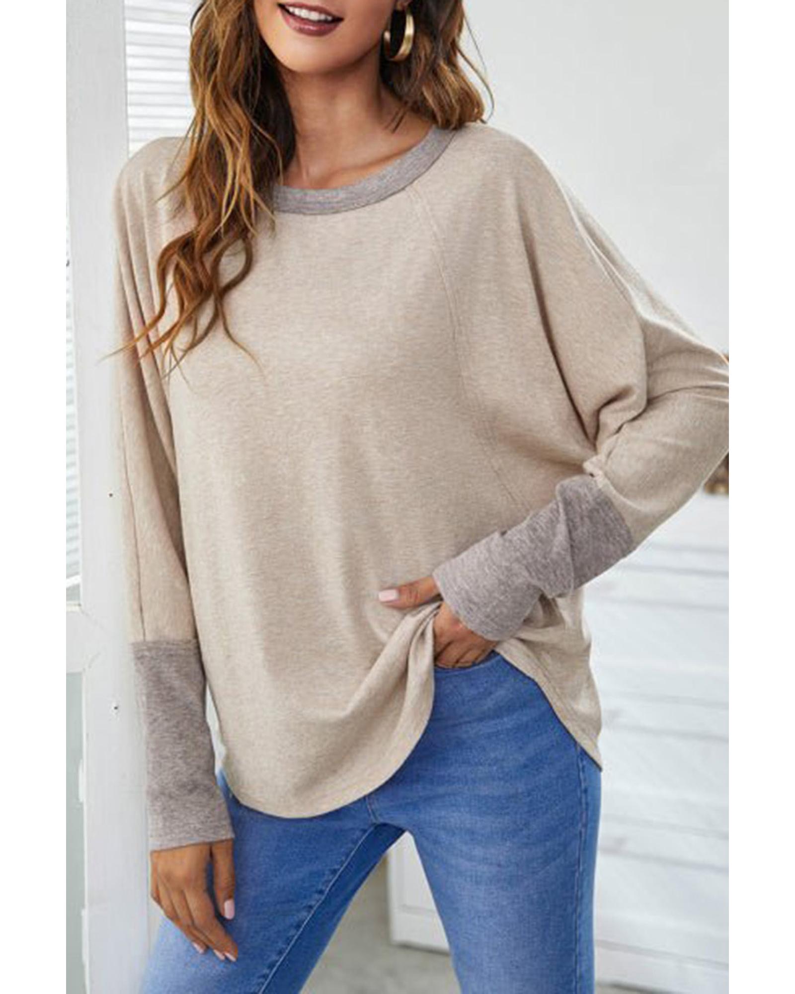 Khaki Contrast Cuffs Batwing Sleeve Loose Top – L