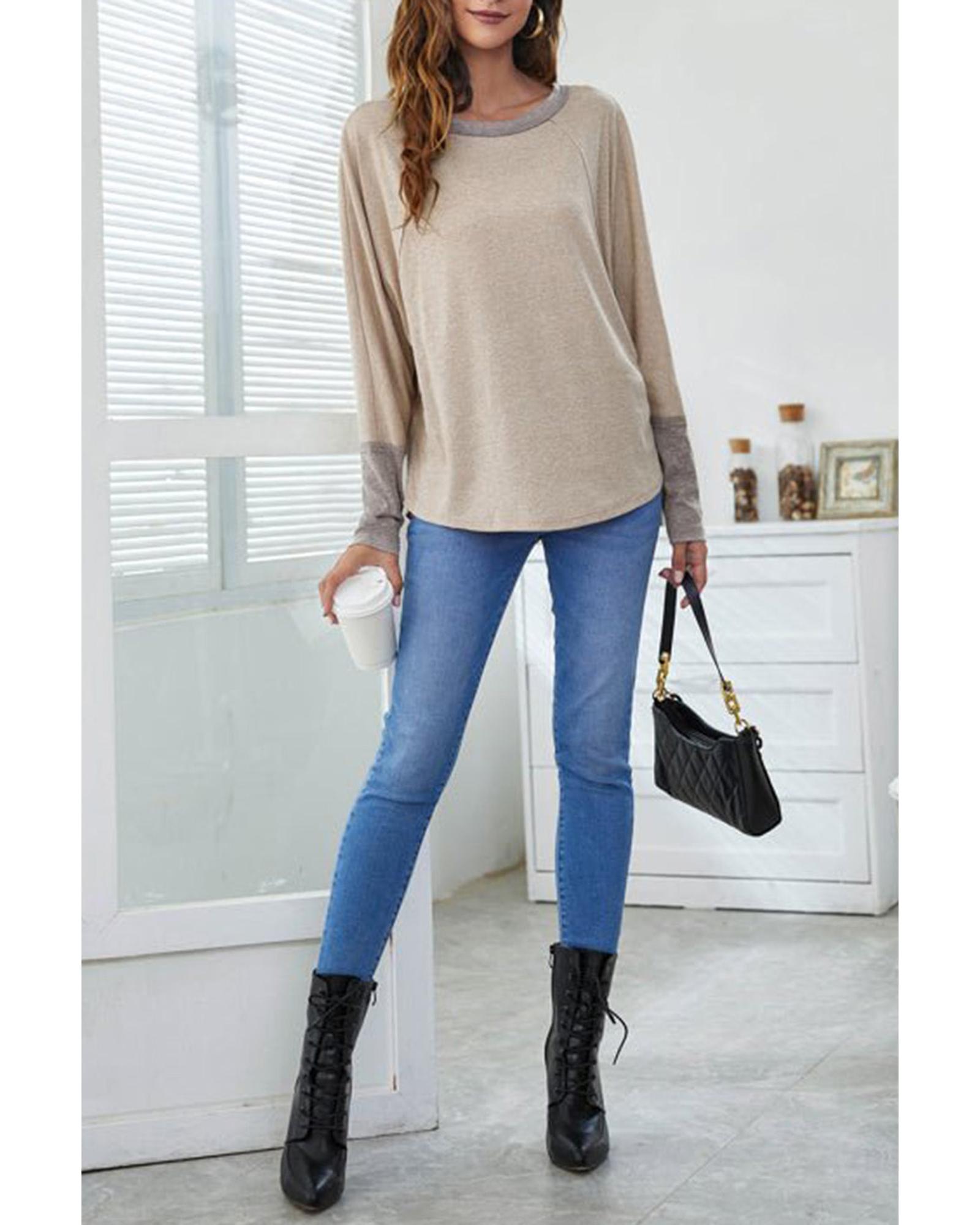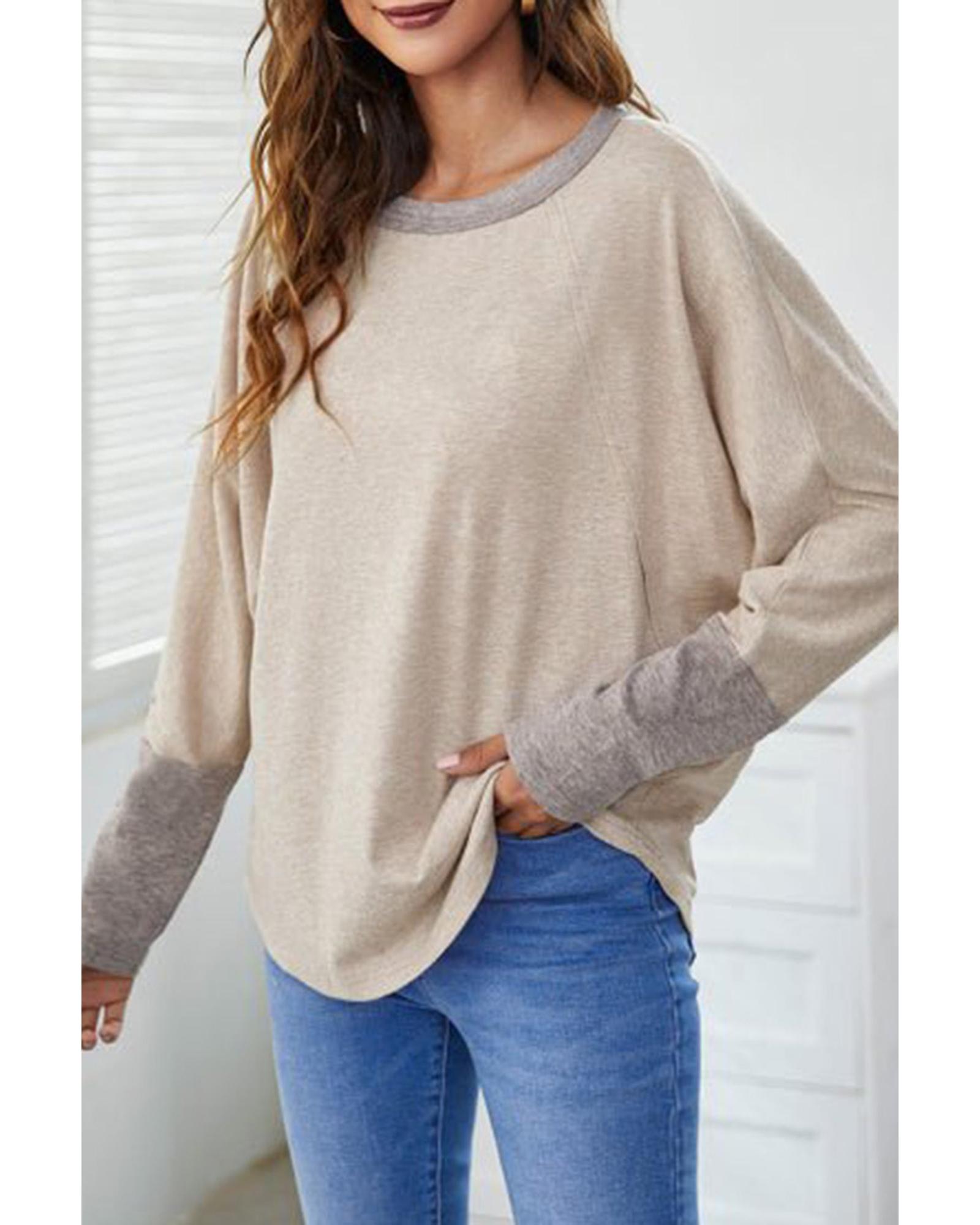 Khaki Contrast Cuffs Batwing Sleeve Loose Top – S