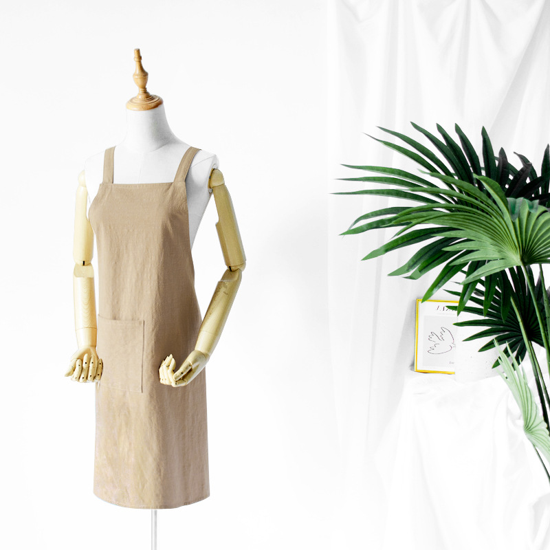 Khaki Cotton Linen H-Back Apron – Solid Color Kitchen Cooking Apron with Pocket
