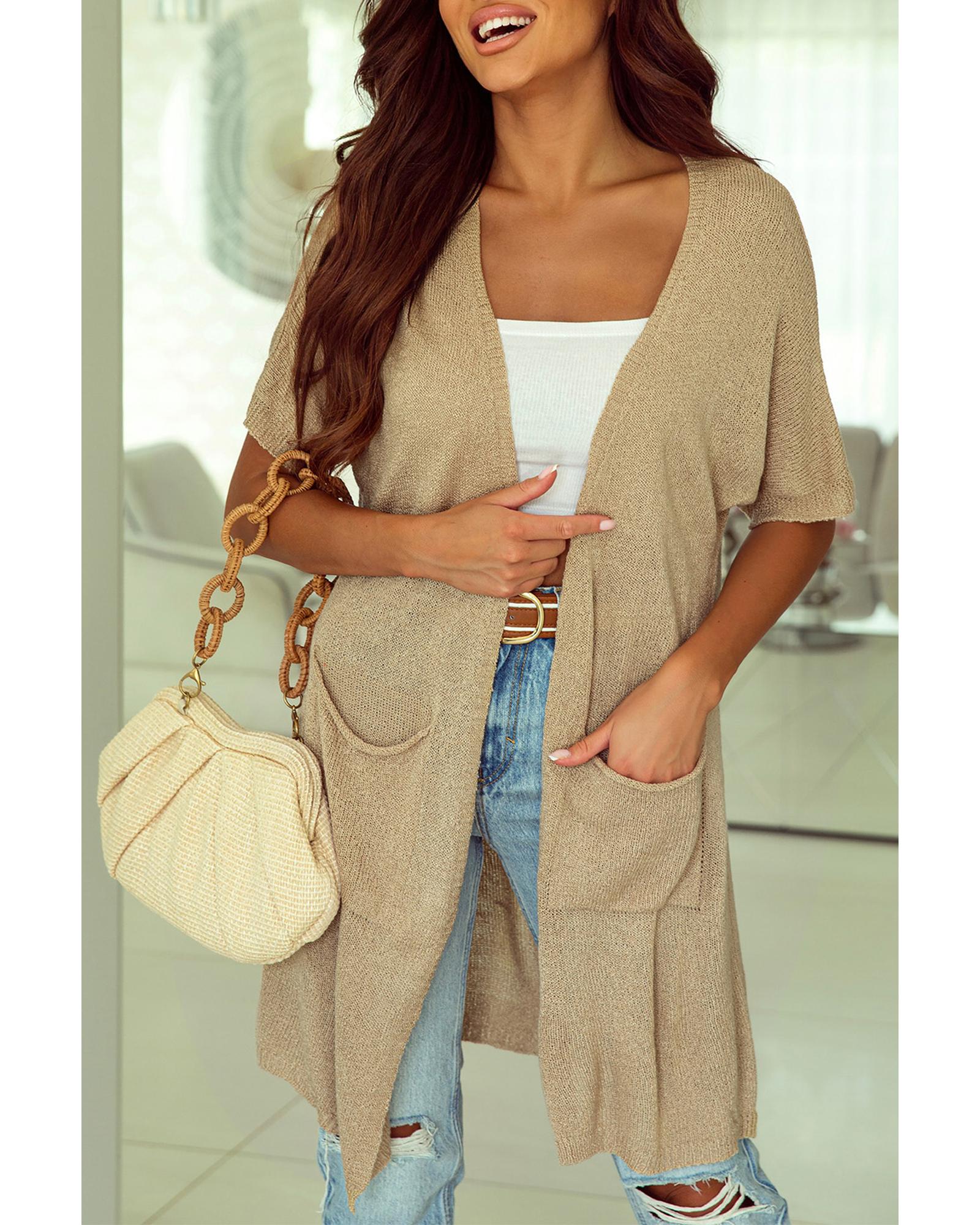 • Khaki Dolman Half Sleeve Pocketed Long Cardigan