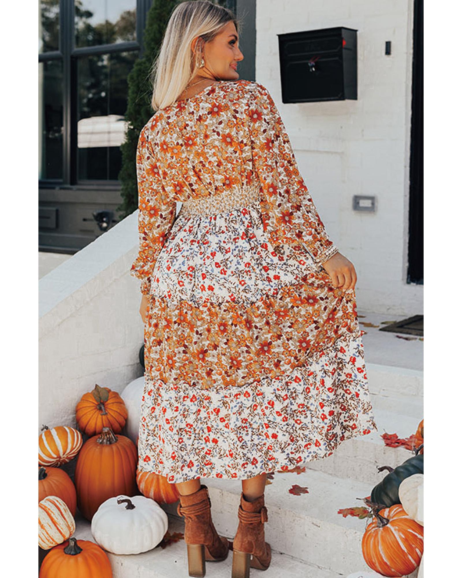 Khaki Floral Print Ruffled Tiered Long Sleeve V Neck Midi Dress - L Original price was: $87.99.Current price is: $47.99.
