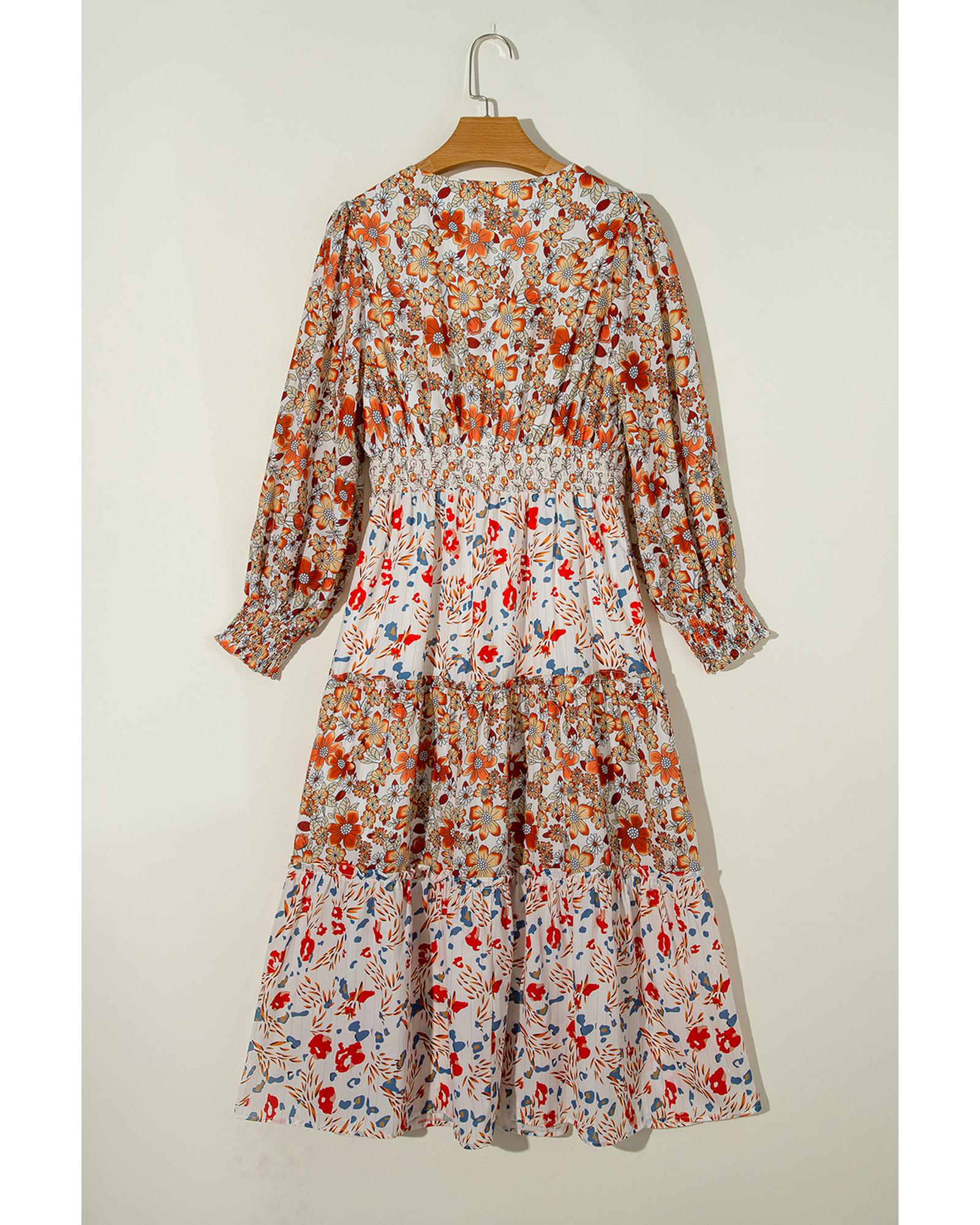 Khaki Floral Print Ruffled Tiered Long Sleeve V Neck Midi Dress – XL