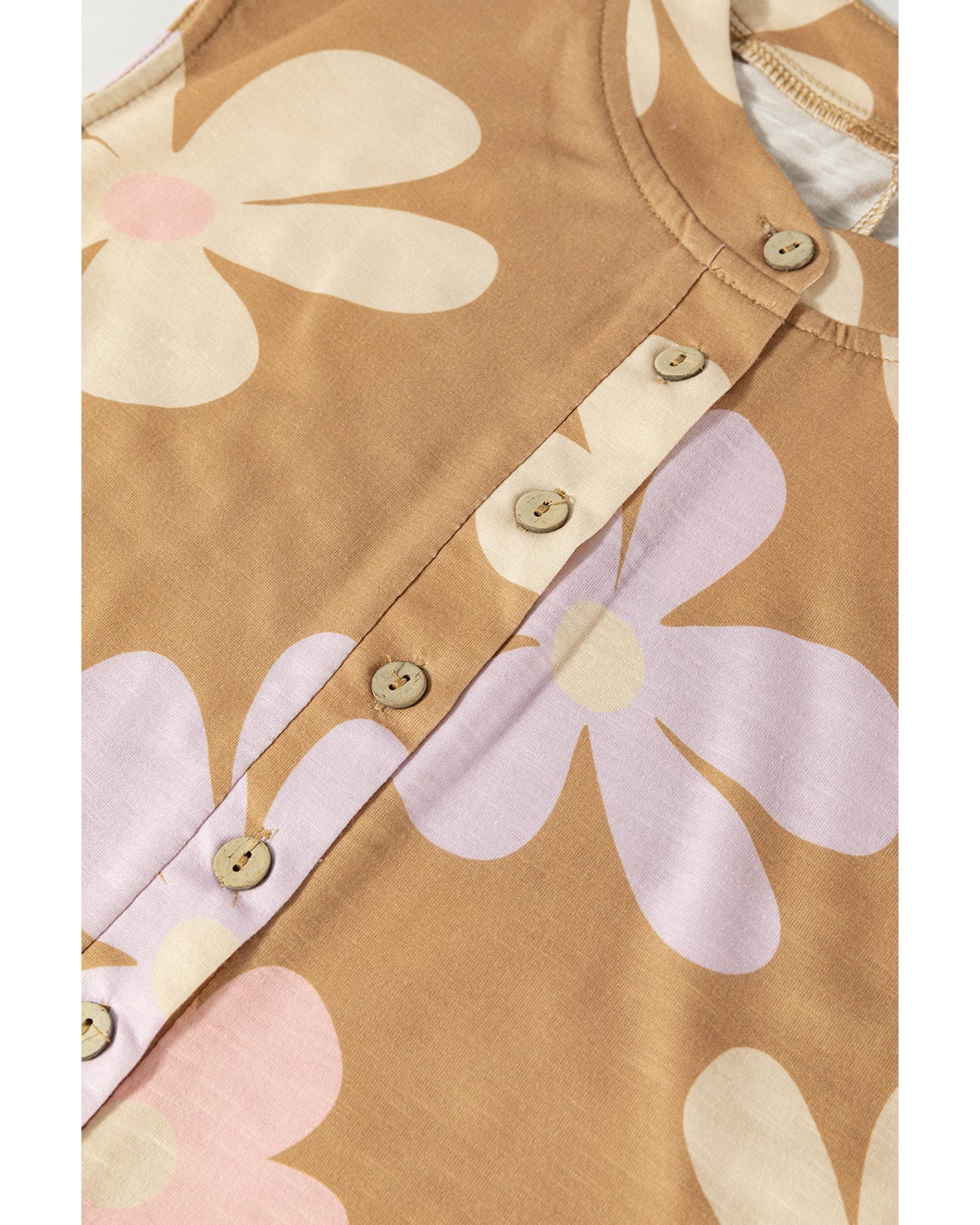 Khaki Floral Print Sleeveless Button up Wide Leg Loose Jumpsuit – L