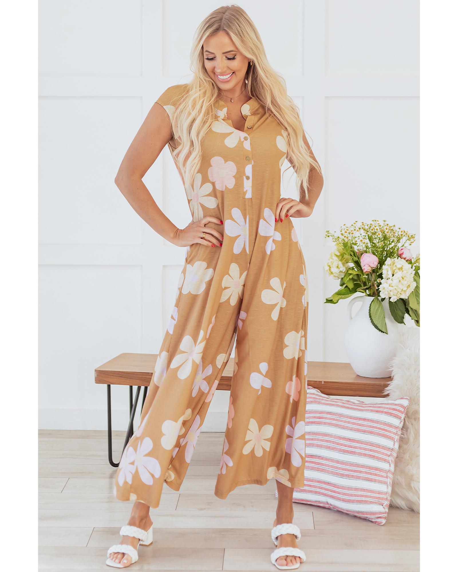 Khaki Floral Print Sleeveless Button up Wide Leg Loose Jumpsuit – M