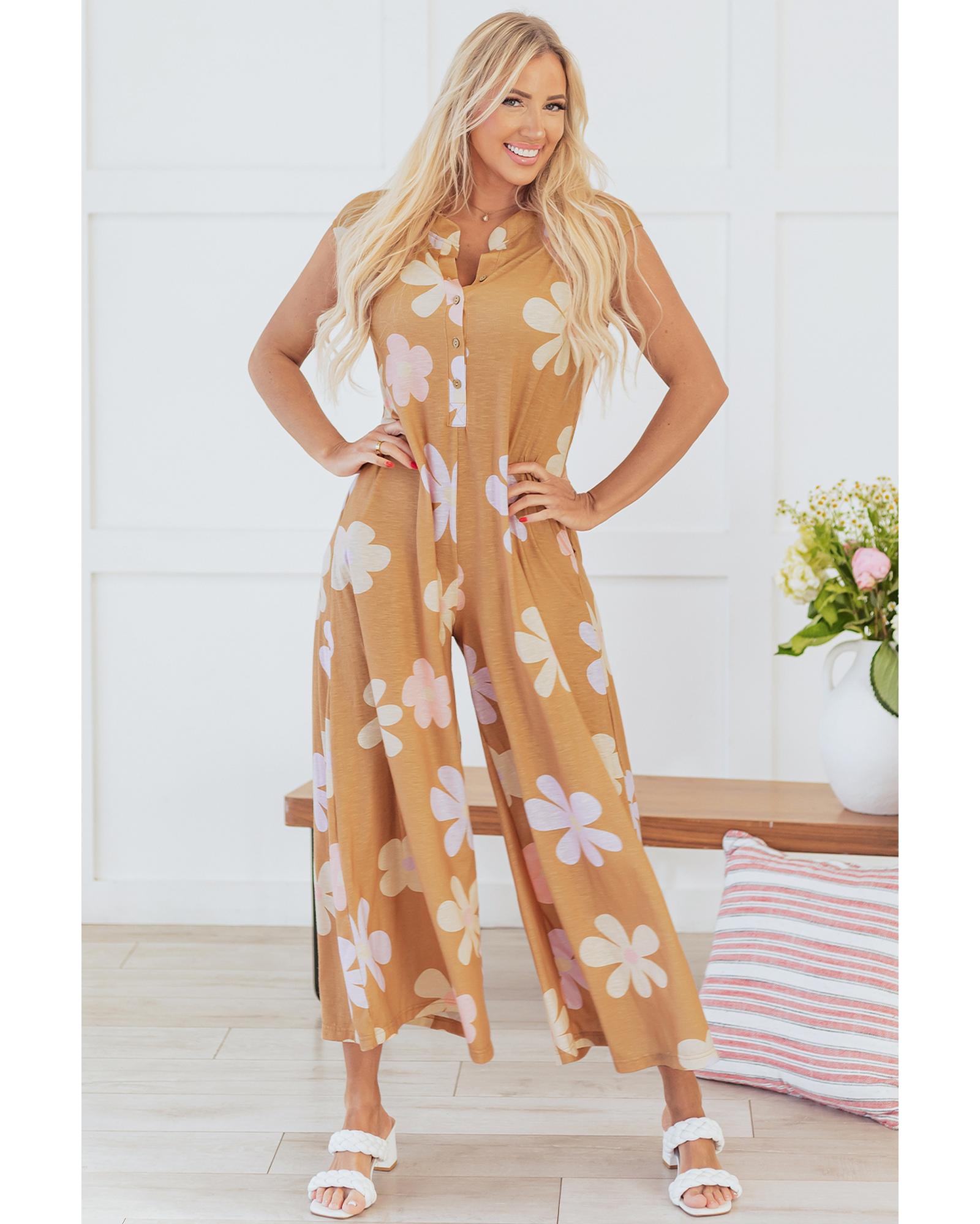 Khaki Floral Print Sleeveless Button up Wide Leg Loose Jumpsuit – XL