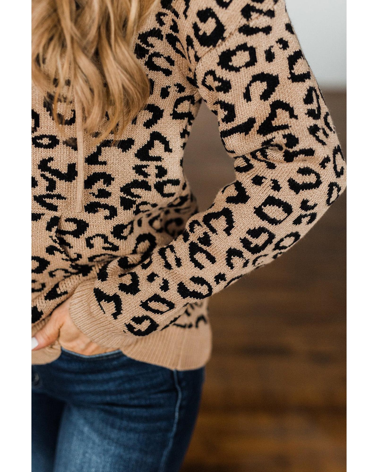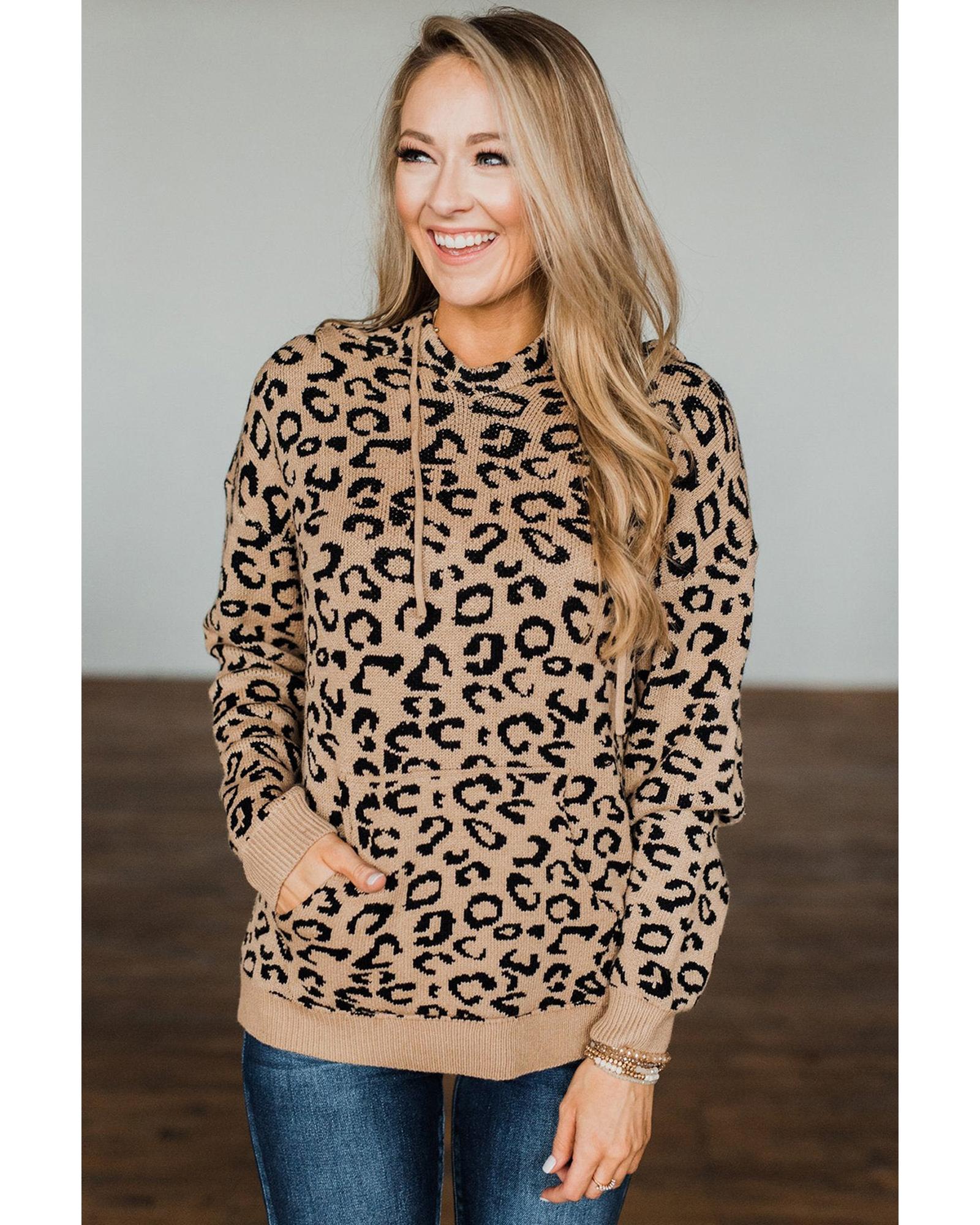 Khaki Leopard Knitted Drawstring Hooded Sweater – L