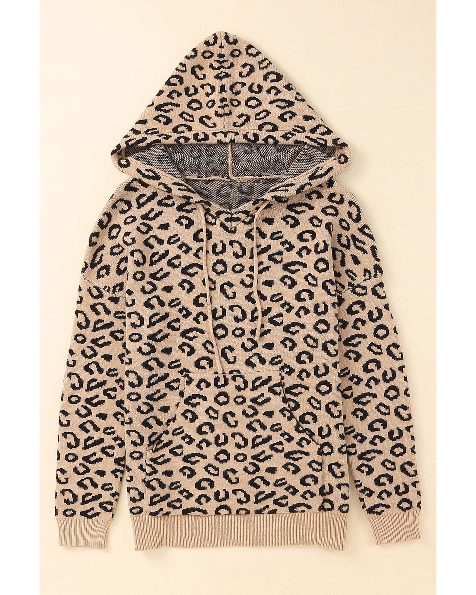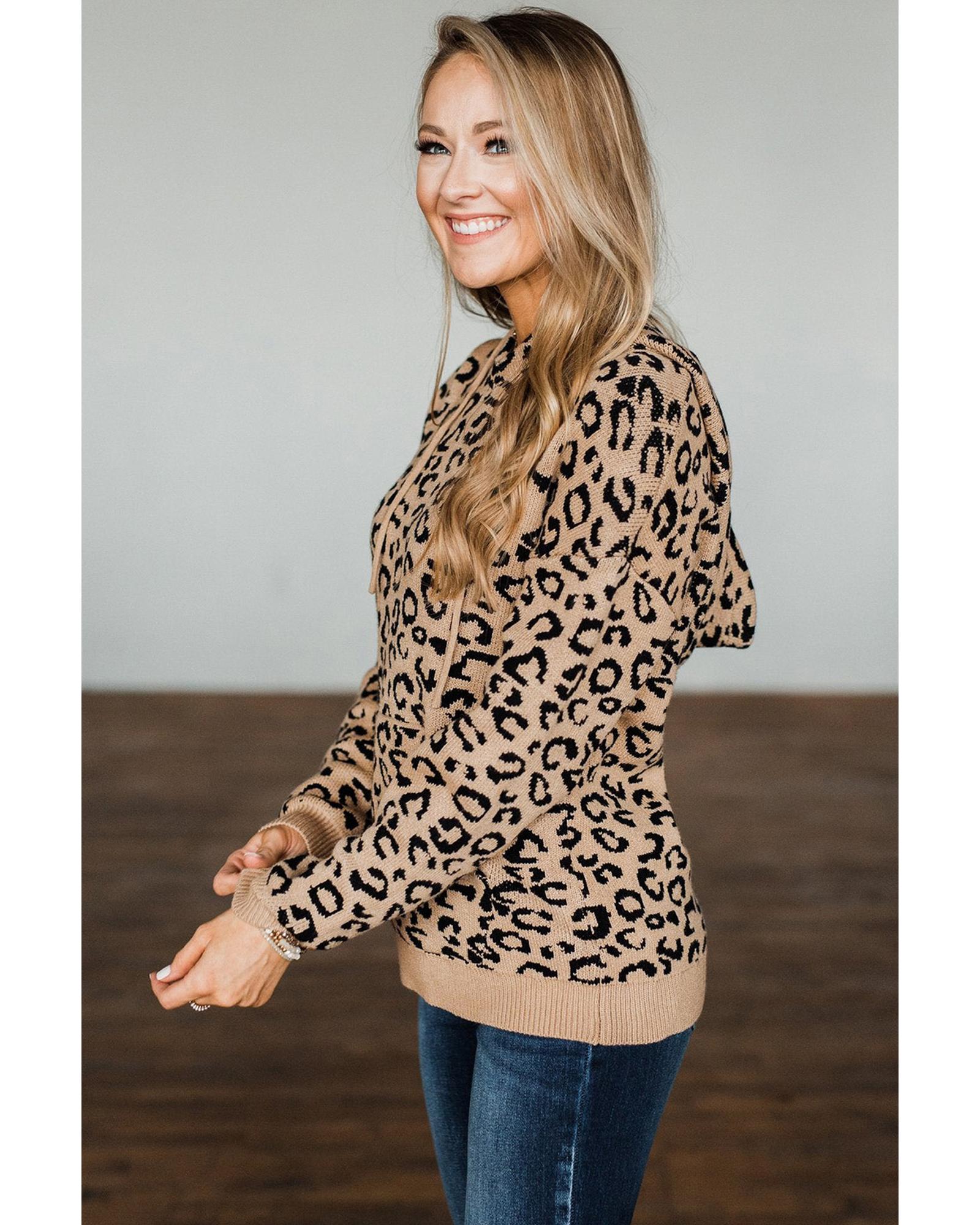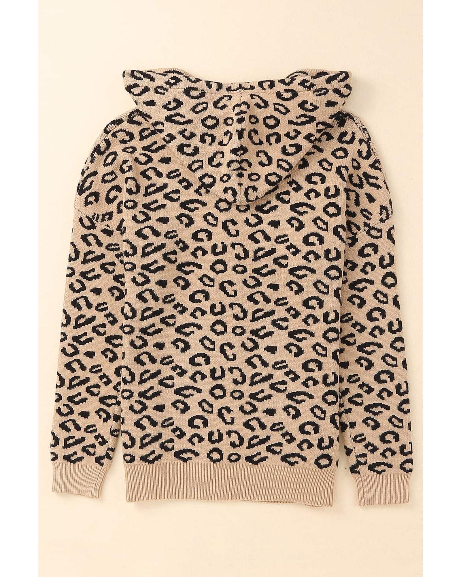 Khaki Leopard Knitted Drawstring Hooded Sweater – M