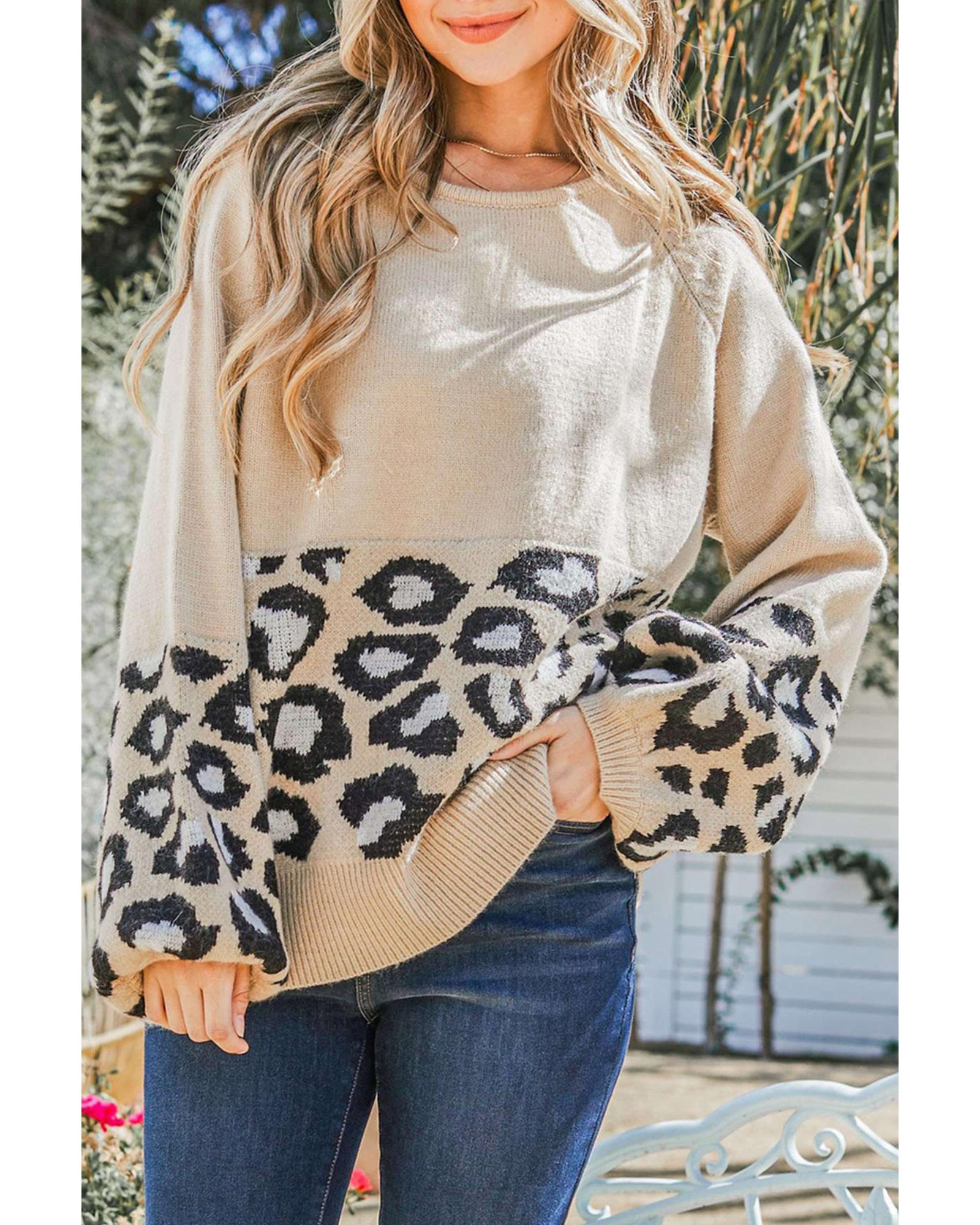 Khaki Leopard Patchwork Knitted Puff Sleeve Sweater – L