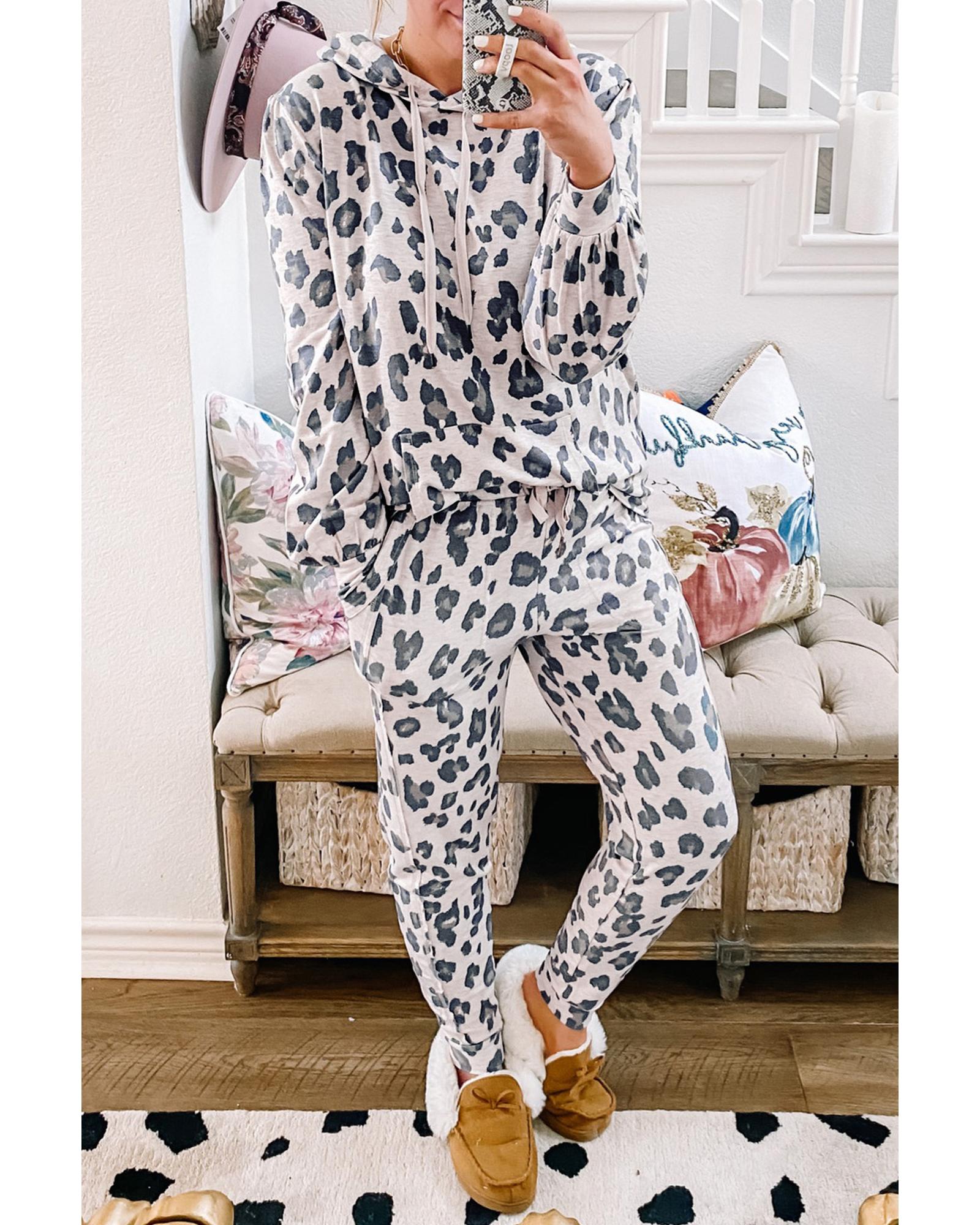 Khaki Leopard Print Drawstring Hoodie and Skinny Pants Lounge Set – M