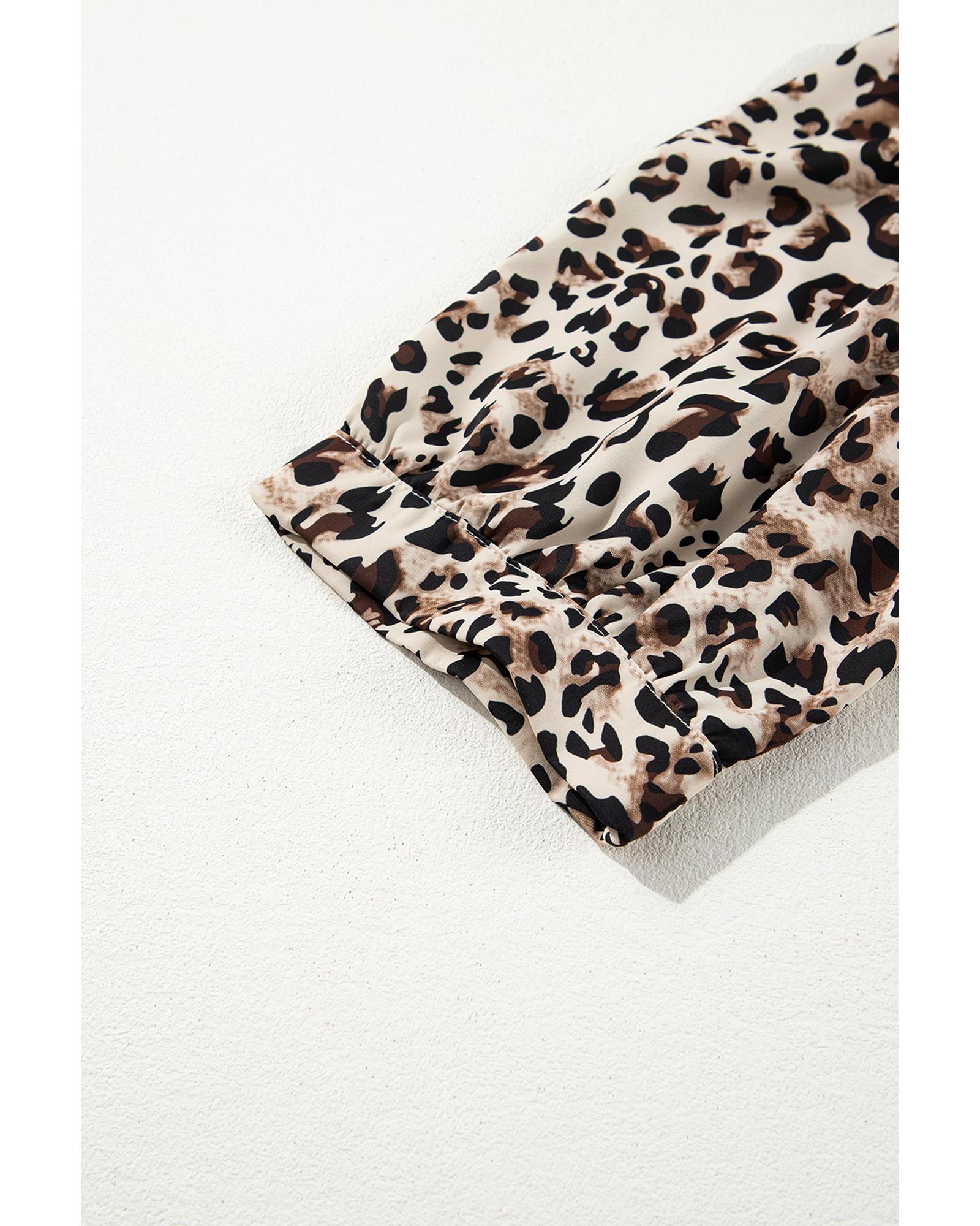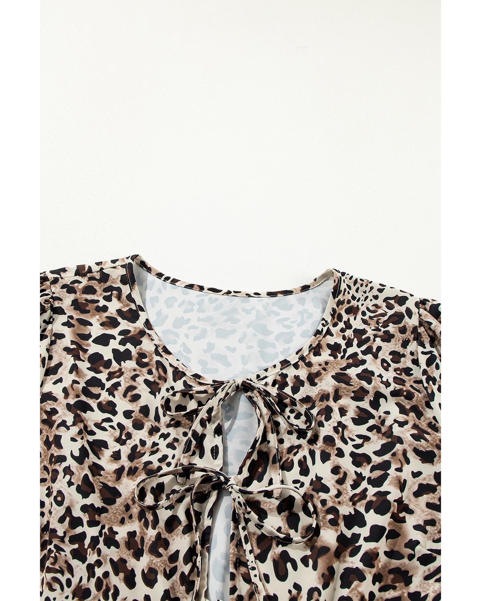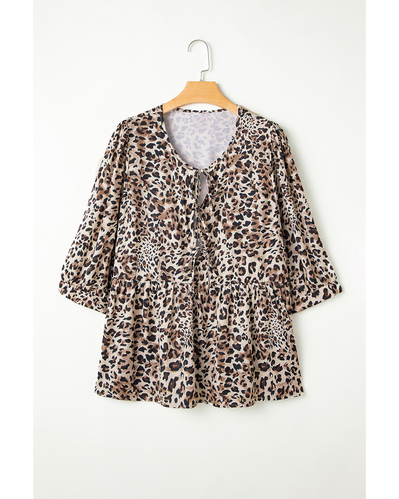 Khaki Leopard Print Lace-up Ruffled 3/4 Sleeve Plus Size Blouse – 1X