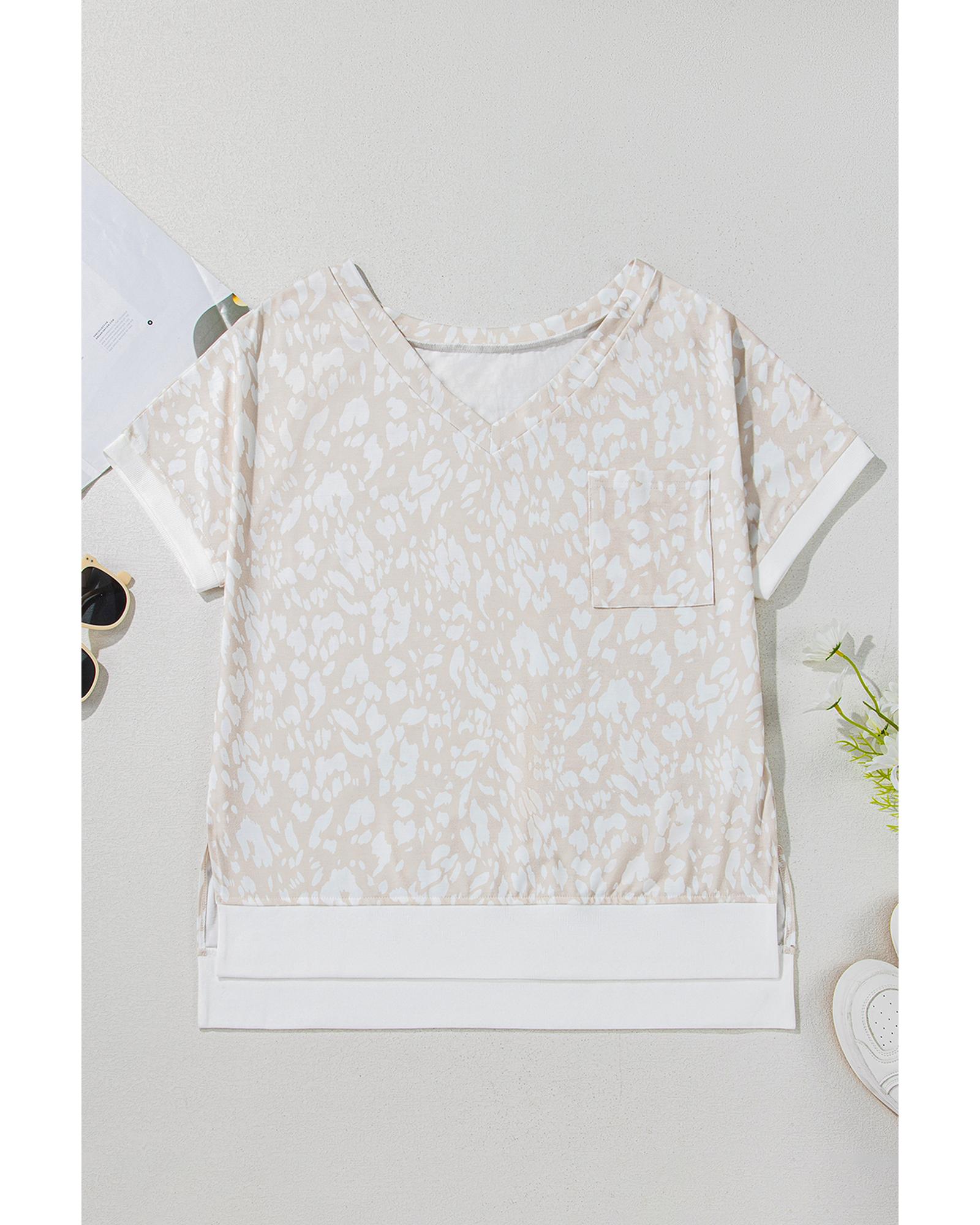 Khaki Leopard Print V Neck Side Slit Loose Fit T Shirt – M