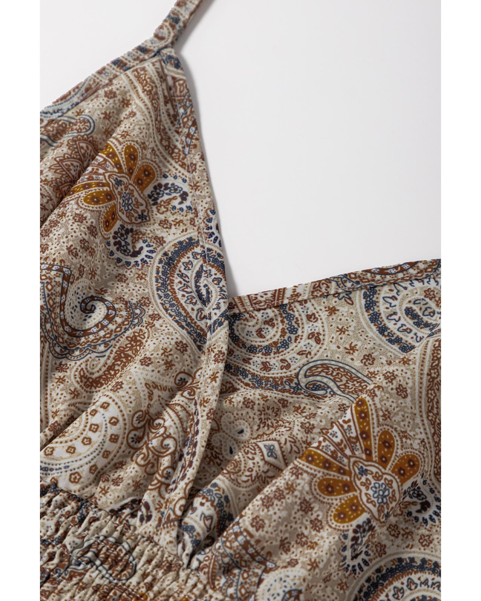 Khaki Paisley Printed Spaghetti Strap V Neck Smocked Babydoll Tank Top – L