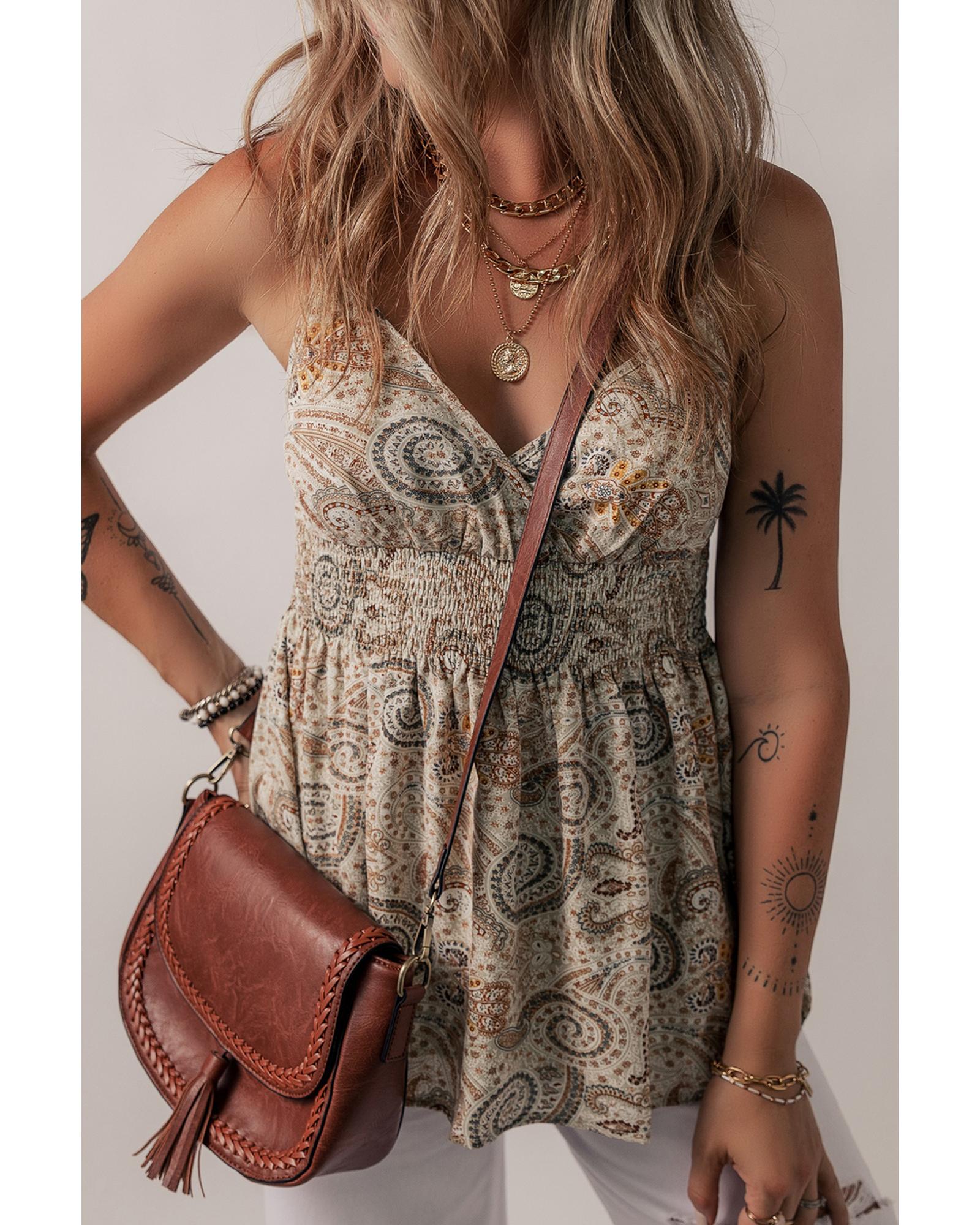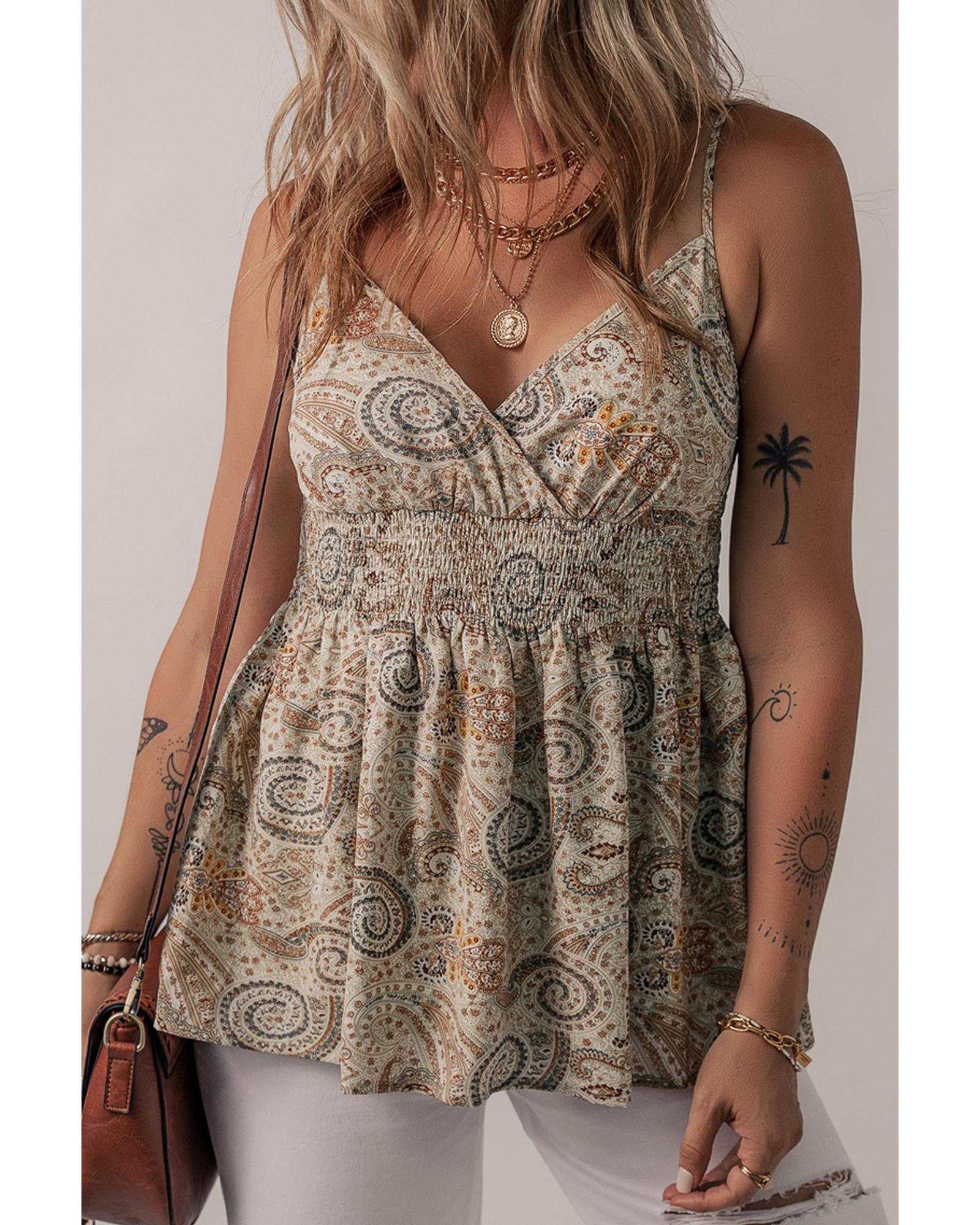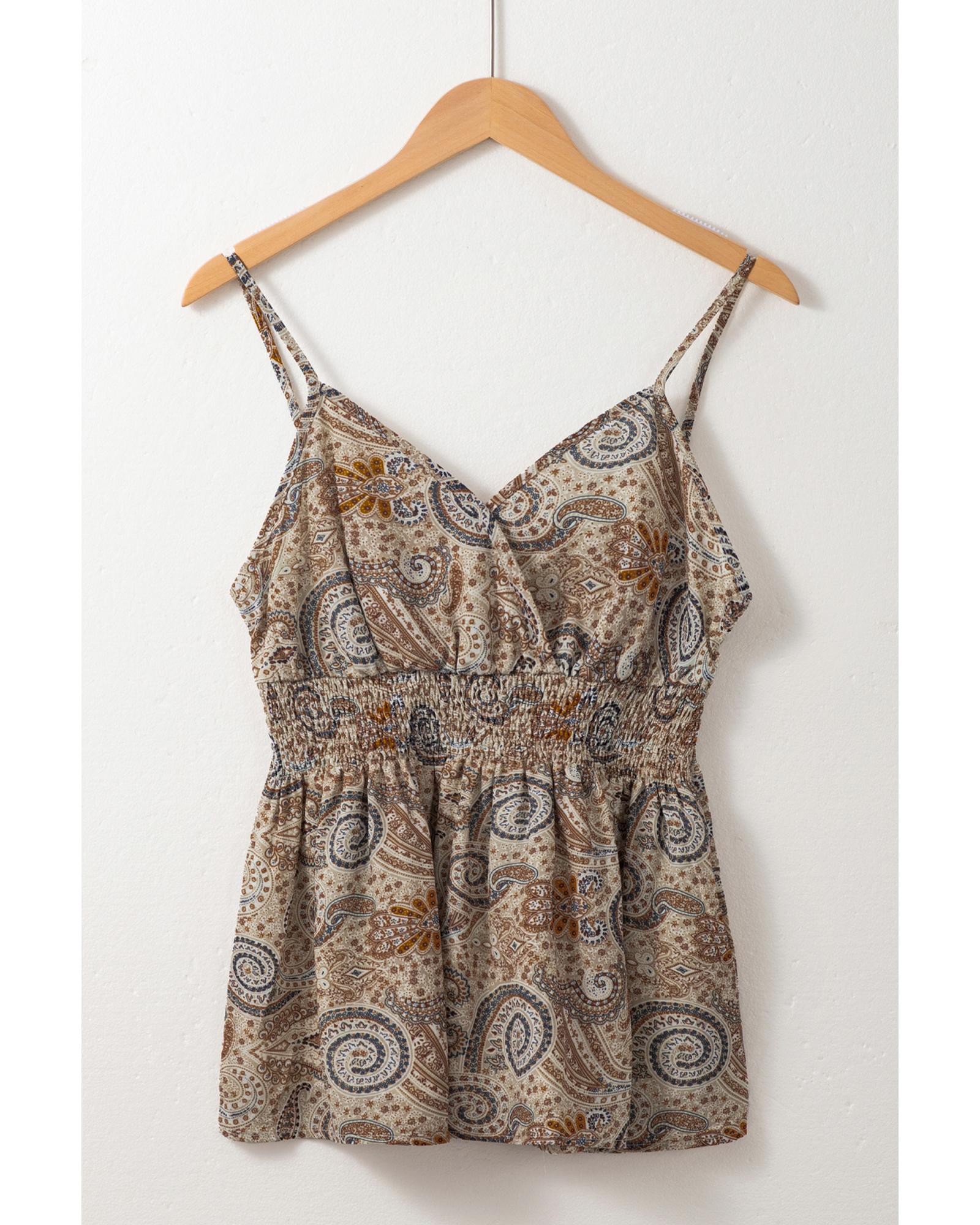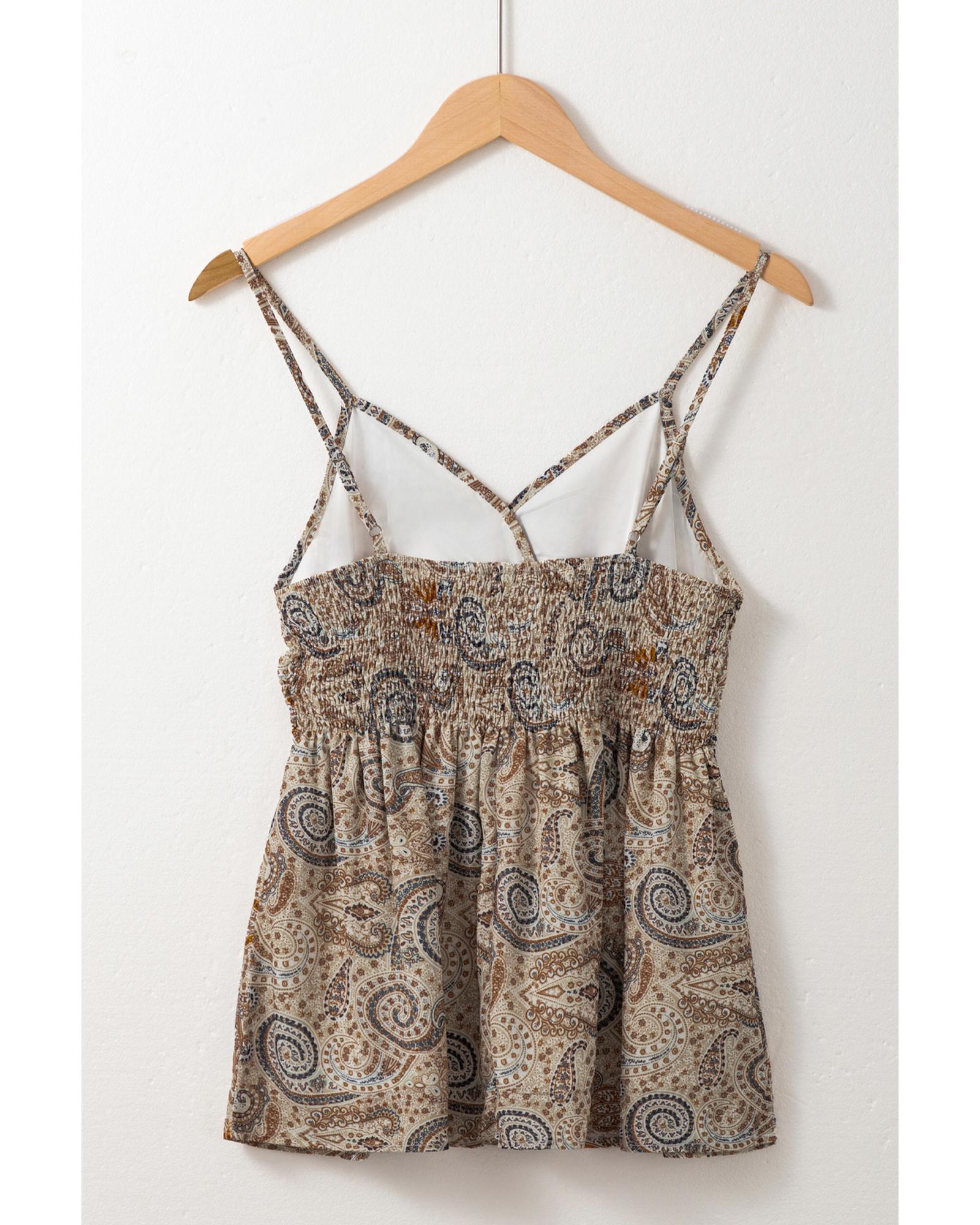 Khaki Paisley Printed Spaghetti Strap V Neck Smocked Babydoll Tank Top – XL