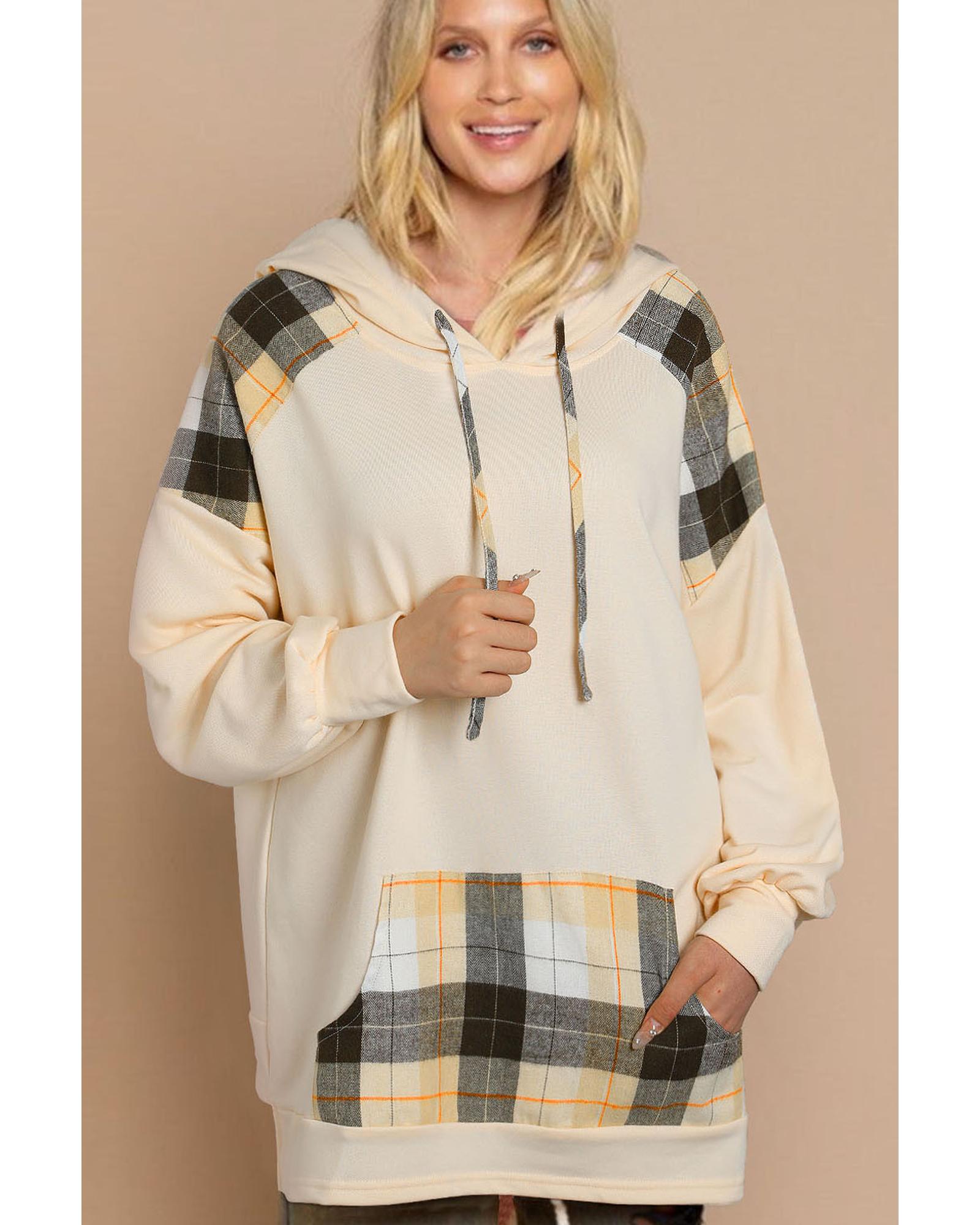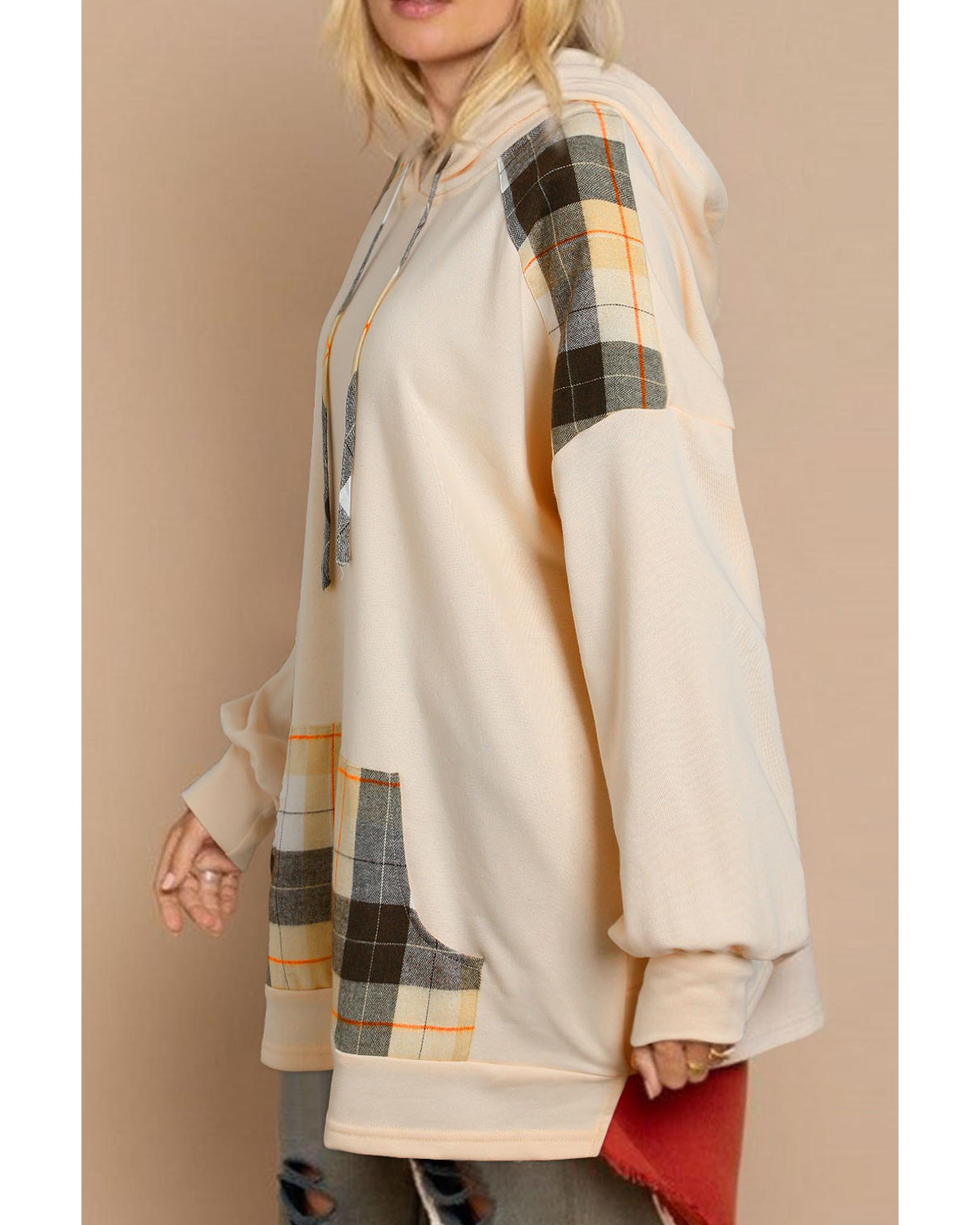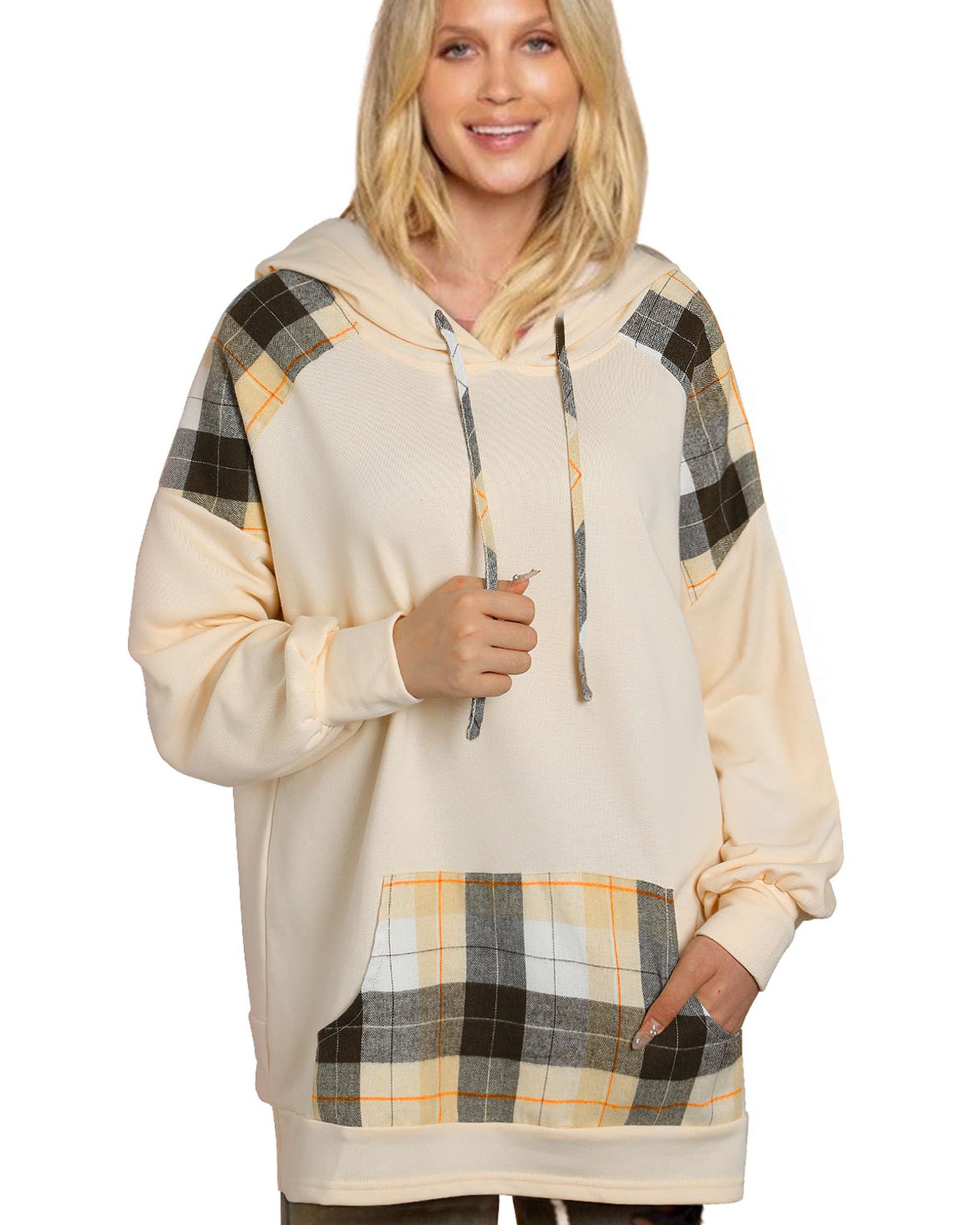- Khaki Plaid Patchwork Kangaroo Pocket Oversized Hoodie