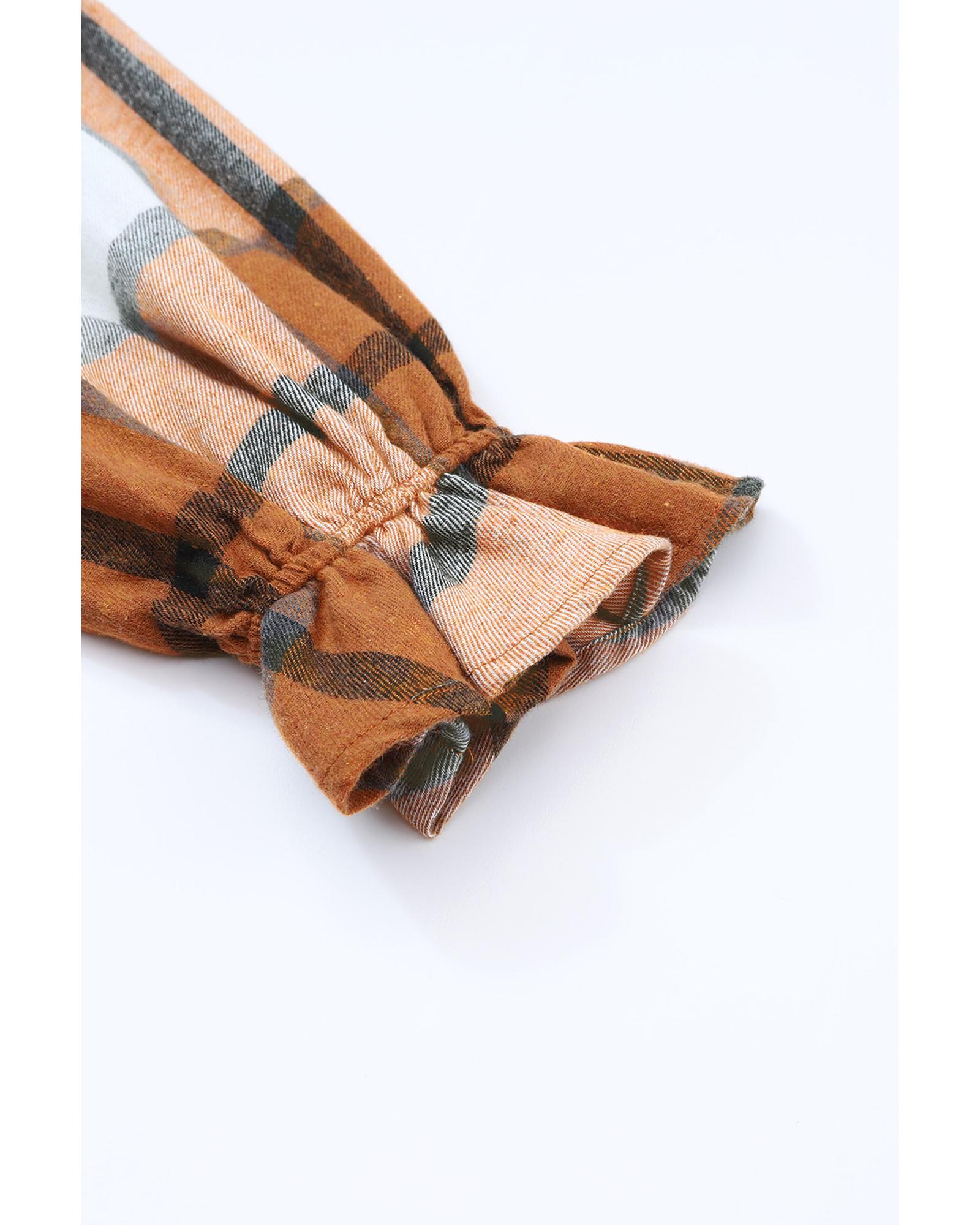 Khaki Plaid Pattern Collared Neck Ruffled Sleeve Shirt Dress - S