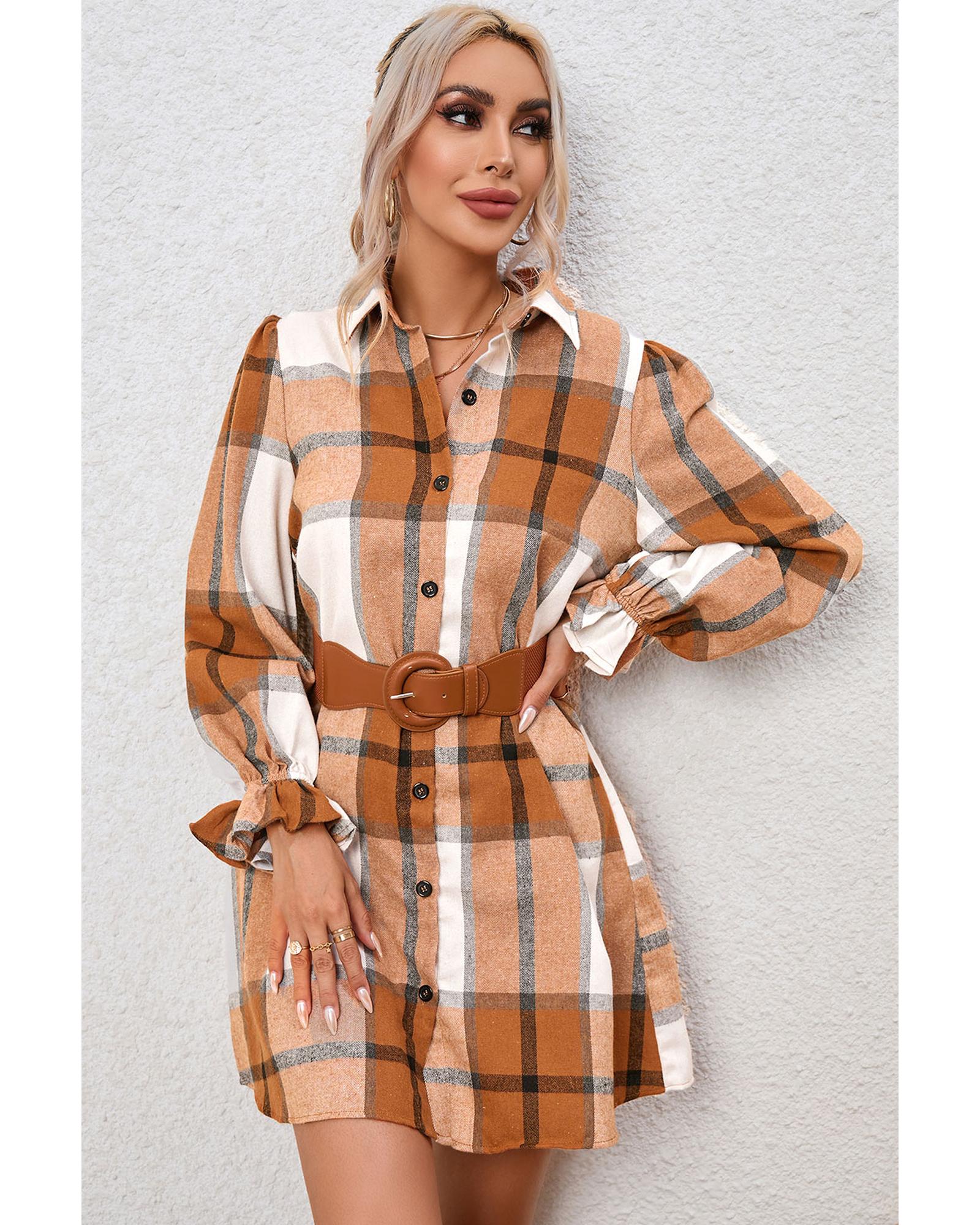 Khaki Plaid Pattern Collared Neck Ruffled Sleeve Shirt Dress – XL