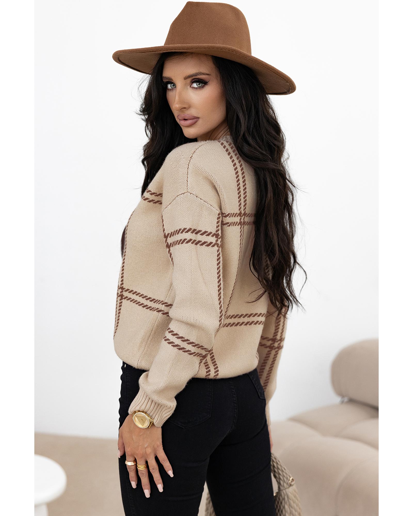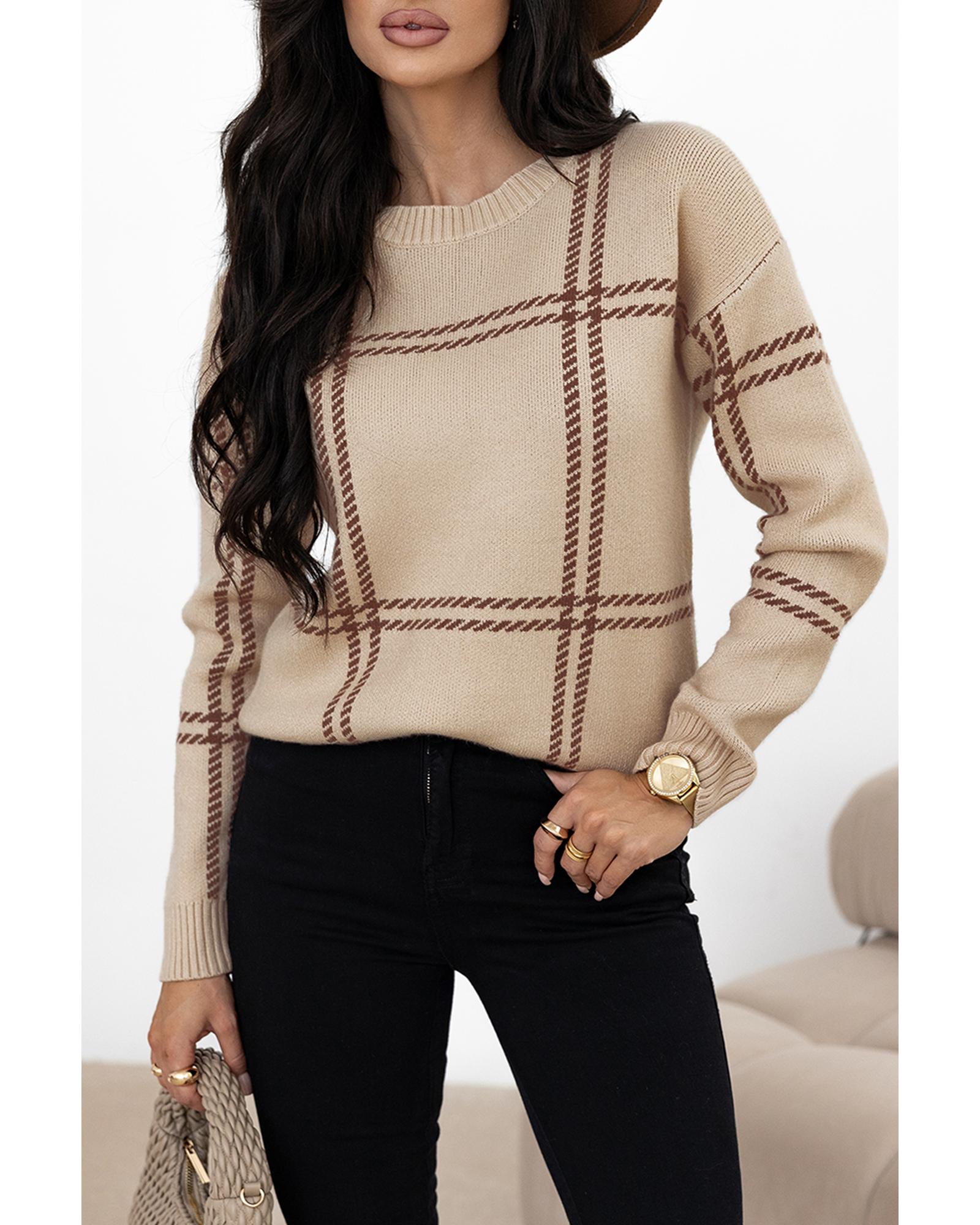 Khaki Plaid Pattern Knitted Drop Shoulder Sweater – L