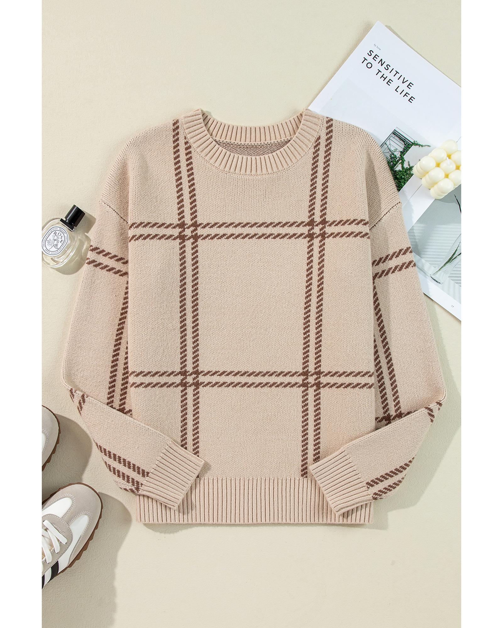 Khaki Plaid Pattern Knitted Drop Shoulder Sweater – S