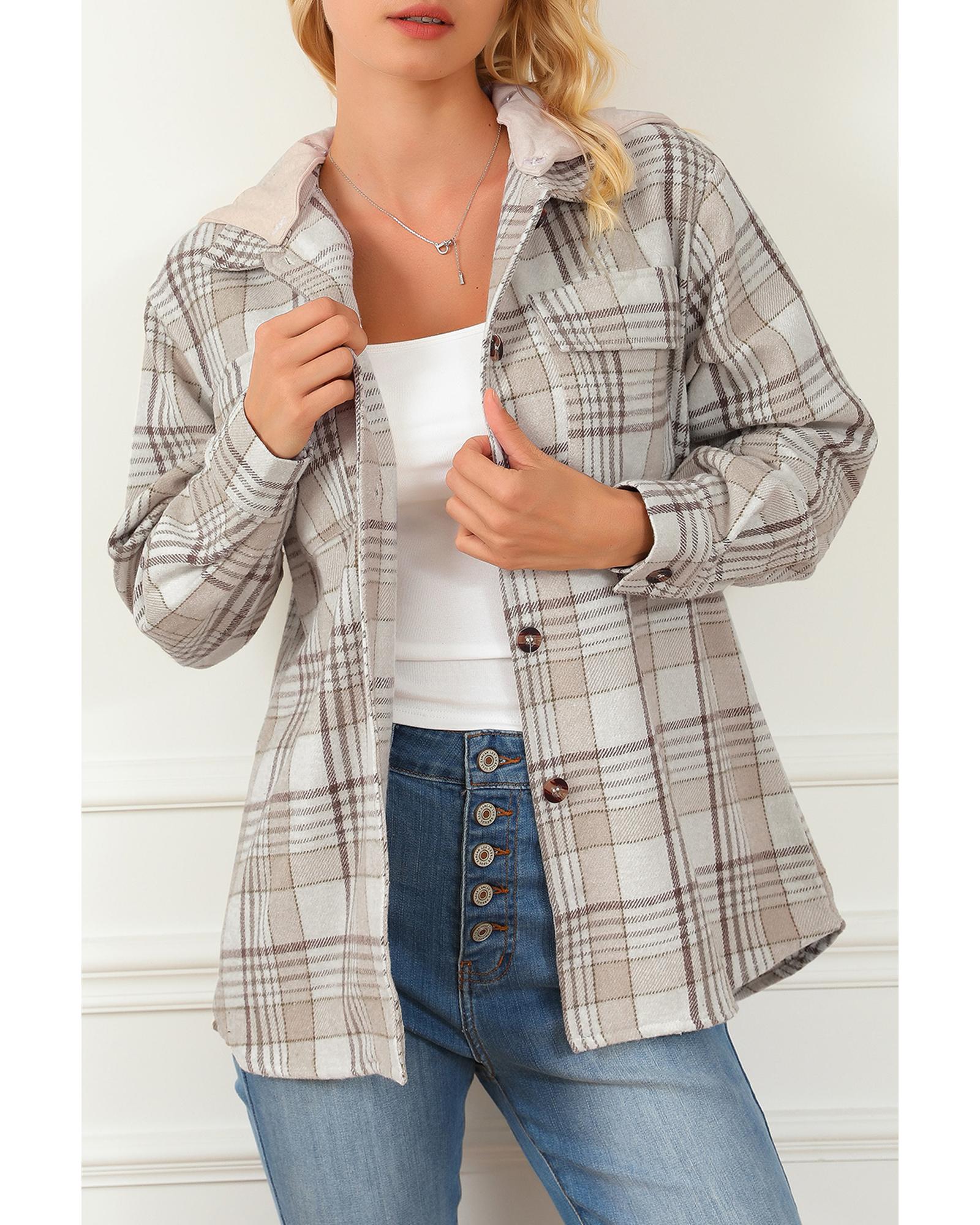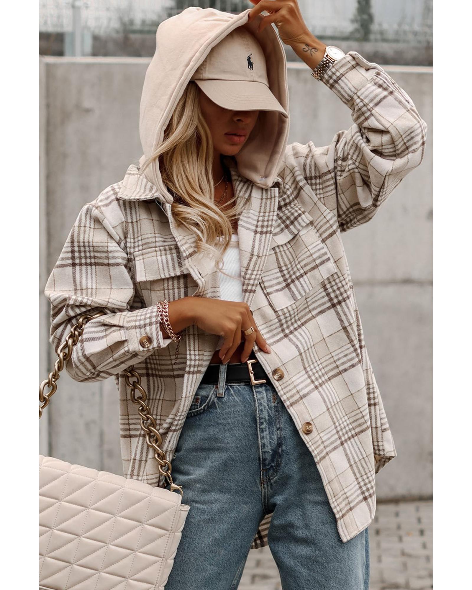 Khaki Plaid Removable Hood Buttoned Shacket – M