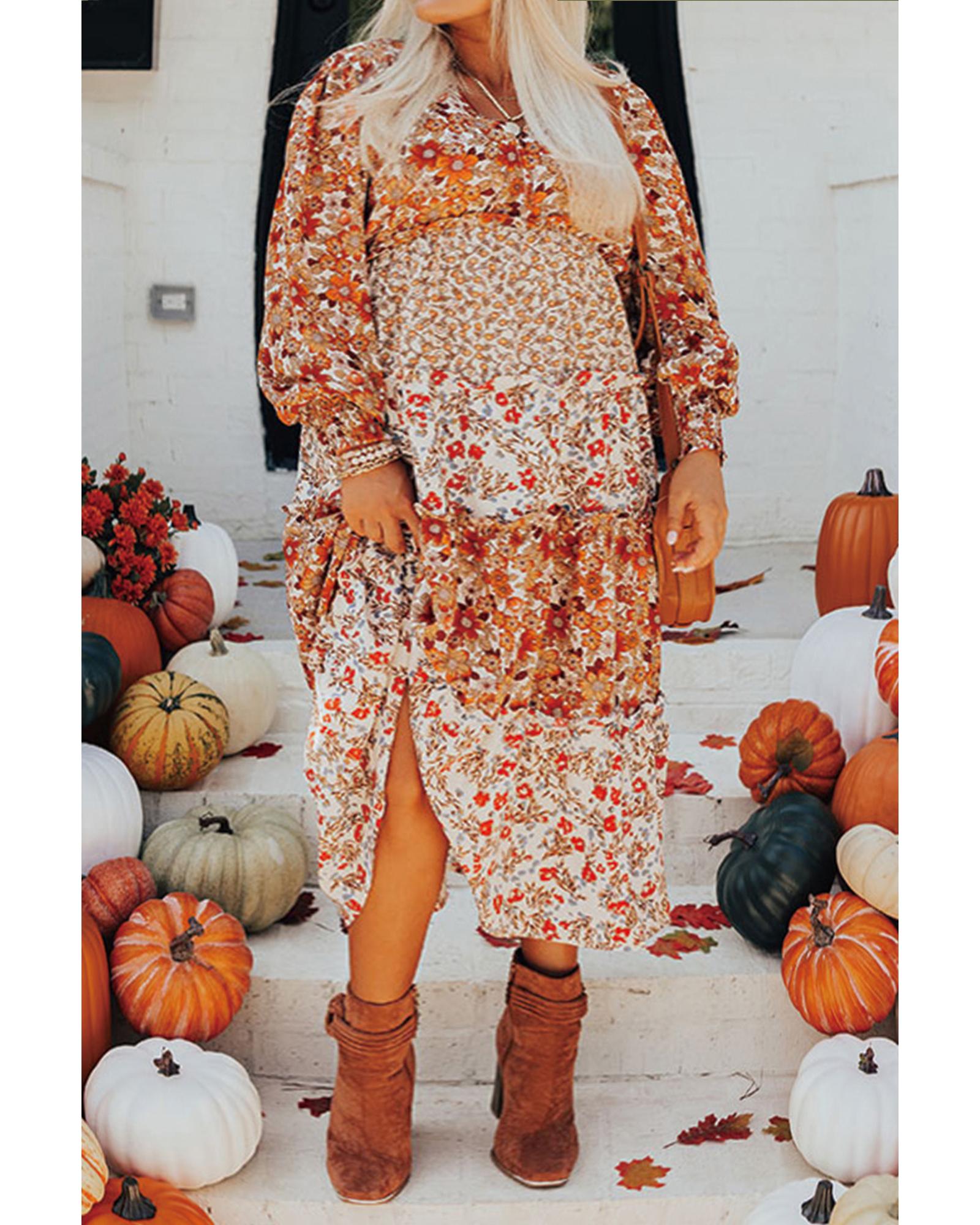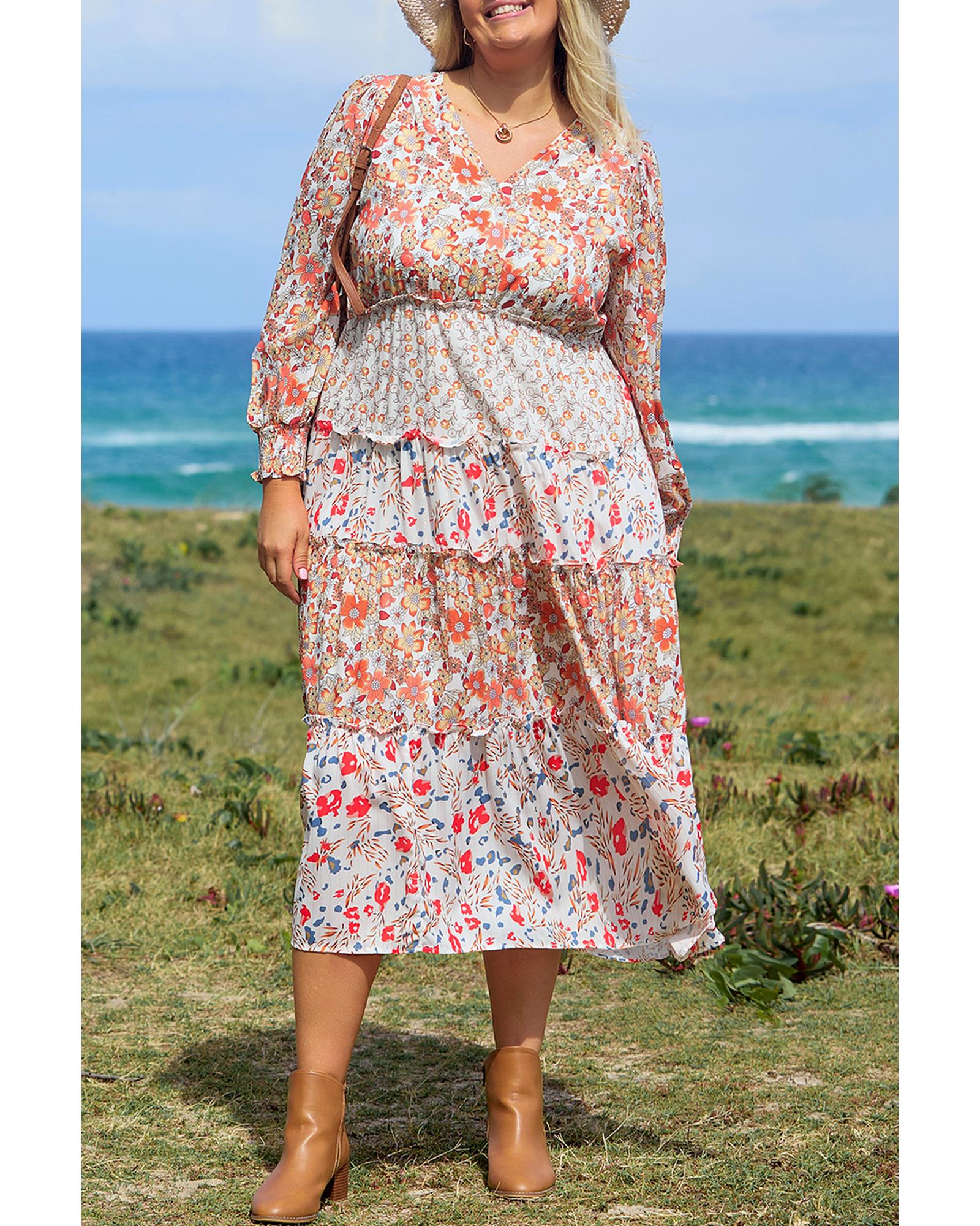 • Khaki Plus Size Floral Tiered Ruffle Maxi Dress
